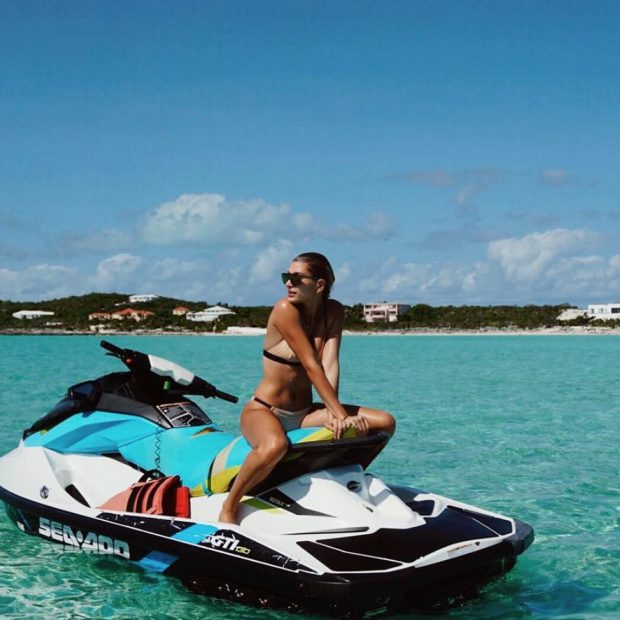 Hailey Baldwin, Karayipler tatilinde krem rengi bikinisiyle spor görüntüsünü koruyor.
