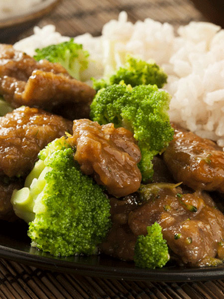 · 1 buçuk kâse bulgur · 250 gram kemiksiz dana eti · 3 yemek kaşığı kanola yağı · 3 yemek kaşığı doğranmış arpacık soğanı · 3 yemek kaşığı doğranmış sarımsak · 1 yemek kaşığı Meksika fasulyesi · 4 adet yeşil soğan · 30 gram uzun şeritler halinde dilimlenmiş zencefil · 2 kâse parçalara bölünmüş brokoli · Yarım kâse tavuk ya da et suyu (Beyaz şarap ilave edilebilir) · 2 yemek kaşığı balzamik sirke