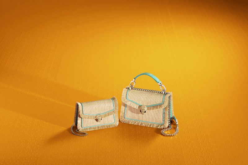 Koleksiyonda yaz mevsiminin yıldızı, Bvlgari’nin oyuncu tavrı ve üstün işçilikle yorumladığı doğadan ilham alan bir malzeme olan rafya öne çıkıyor. Bvlgari’nin zanaatkarları tarafından elde edilen olağanüstü yumuşak dokusuyla ünlü Serpenti Diamond Blast‘ın biri çıkarılabilir üst saplı ve kalın altın zincir kayışlı, diğeri ise mücevherden ilham alan daha ince bir zincirli iki stili bulunuyor.