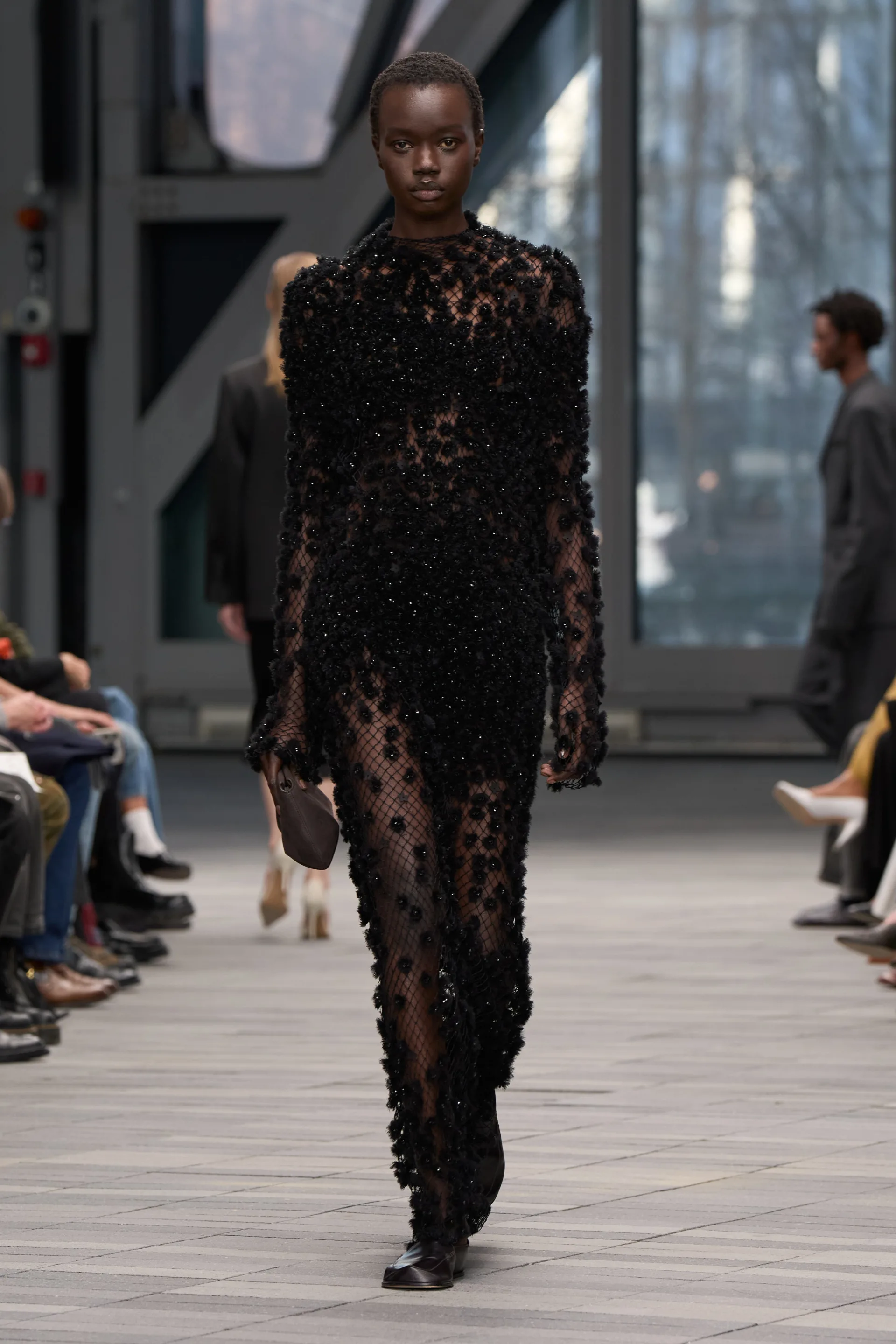 Tüm stillerde siluet uzun ve düz bir görünüm sergiliyor. Kusursuz ve dar terzilik detayları, beklenmedik sırt dekolteleri ve kolsuz dokunuşlarla tasarımlarda bir araya geliyor. Yoğun işçilikle hazırlanan elbiseler, sade arka yüzeylerle kontrast oluşturuyor. Beyaz yakalar görünümleri öne çıkarırken, biker yakalar tasarımlara daha sert bir hava katıyor. Shearling yakalar ihtişam duygusu yaratıyor ve bu detay zamanla tam bir shearling paltoya dönüşüyor. Doku ve renkler, koleksiyonda kentsel bir atmosfer oluşturuyor. Nötr tonlar koleksiyonda hakimiyet kurarken, turuncu ve bordo tonları görünümü canlandırıyor. Koleksiyon, yün, jarse, kadife, lamine saten, pamuk, grogren ve spazzolato ile opak ve transparan derilerle geniş bir kumaş seçkisi sunuyor.