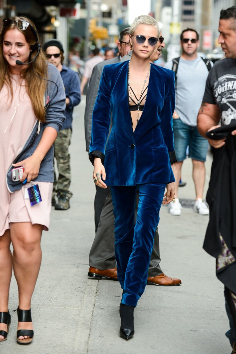 Kadife takımı ve bralette’i ile; maskülen ve feminen arasındaki dengeyi yine harika bir şekilde kuruyor.
