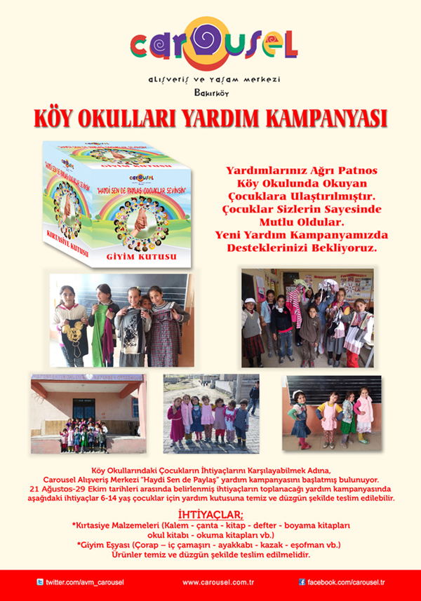 Carousel Alışveriş ve Yaşam merkezi, 2015- 2016 yeni eğitim ve öğretim yılının başlamasına günler kala, önemli bir sosyal sorumluluk projesi olan “Köy Okulları Yardım Kampanyasını” başlatıyor. Doğudaki Köy okullarının ihtiyacı olan kırtasiye malzemeleri ve giyim ürünlerini 29 ekim tarihine kadar toplayarak oradaki 6-14 yaş arası çocukların kış dönemi ihtiyaçlarını karşılamayı hedefliyor. Sonbahar kapımızı çalarken Carousel alışveriş merkezi mağazalarında Okul’a dönüş hazırlıkları da hızla devam ediyor. Siz de Carousel’e gelerek Kampanya’ya katılıp, çocuklara yardımda bulunabilir, Carousel’in 100’ü aşkın seçkin mağazasında indirim avantajlarını yakalayabilirsiniz.