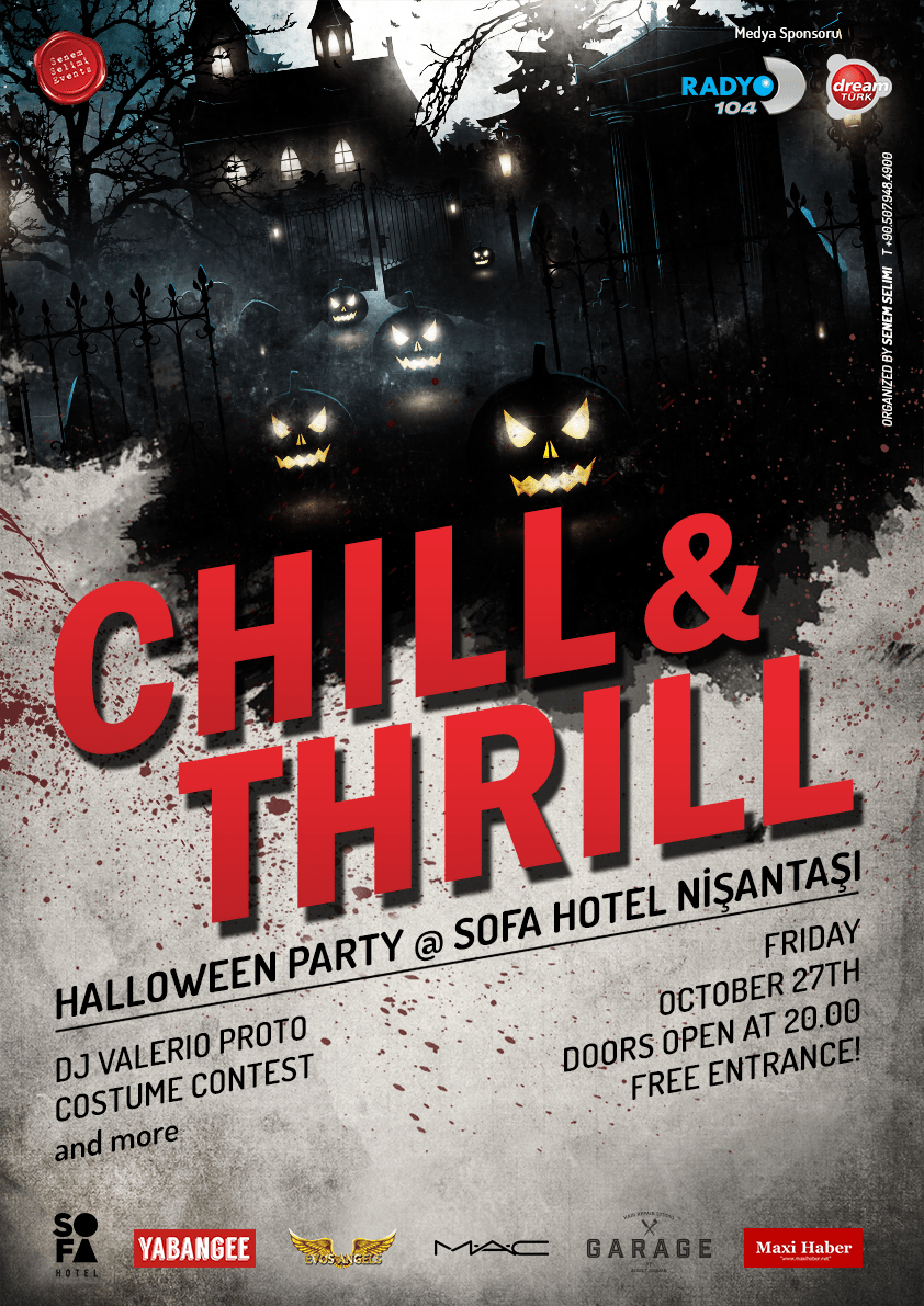 27 Ekim Cuma akşamı 20:00’da Sofa Hotel Nişantaşı’nda gerçekleşecek olan geleneksel Kostümlü Cadılar Bayramı eğlencesi CHILL & THRILL PARTY eğlence severleri buluşturuyor. Bir festival tadında olacak olan parti İtalyan DJ Valerio Proto’nun hazırladığı enerjik parçalar eşliğinde tüm gece devam edecek.