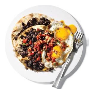 1. Salsa sosu hazırlamak için domates, soğan, Meksika biberi, bir limonun yarısının suyu, kişniş ve sarımsağı blender’da ezin. Biraz pütürlü kalsın. Tatlandırmak için tuz ve karabiber ilave edin. Kenara alın ve diğer malzemeleri hazırlarken tatların birbirine karışabilmesi için biraz bekletin. 2. Küçük bir karıştırma kasesinde, siyah fasulye, kimyon ve kalan limon suyunu karıştırın. Tatlandırmak için tuz ve karabiber ekleyin. Bir çatal yardımıyla fasulyeleri hafifçe ezin. Karışım çok kuru görünüyorsa ılık su ekleyebilirsiniz. 3. Yapışmaz yüzeyli bir tavaya pişirme spreyi sıkıp orta ateşte ısıtın. Yumurtaları tavaya kırın, sarıları akıcı bir kıvamda olacak şekilde beyazları pişinceye kadar ocakta tutun. Başka bir tavada tortillaların her iki tarafını orta ateşte bir dakika kızartın. 4. Fasulyeleri sıcak tortillaların üzerine yayın, yumurtaları ve salsayı ekleyin. Bekletmeden servis yapın. 4 Kişilik / Porsiyon başına: 431 kalori, 16 gr yağ, 48 gr karbonhidrat, 801 mg sodyum, 7 gr lif, 21 gr protein.