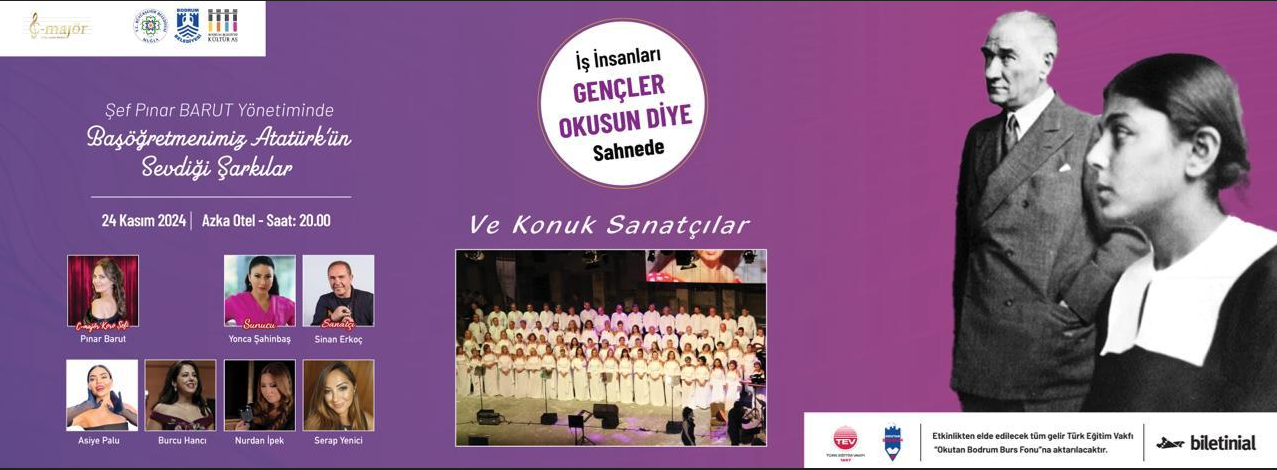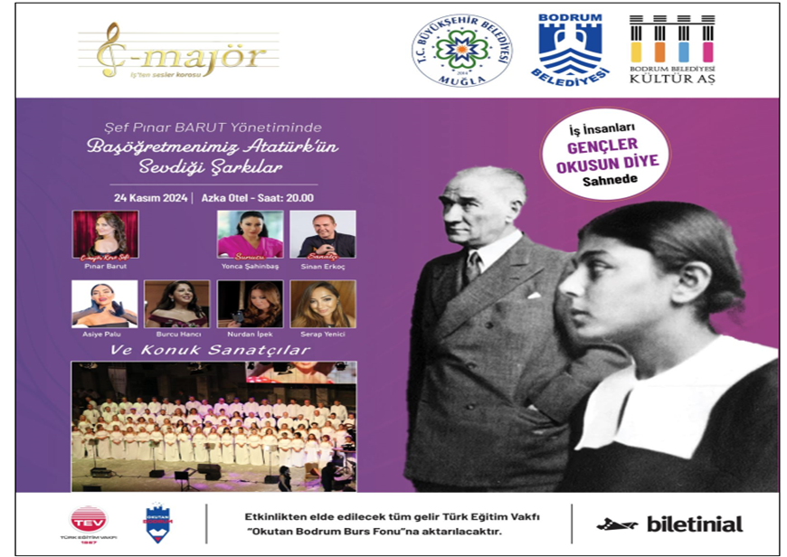 İş dünyasının önde gelen isimlerinden oluşan Cmajör Türkiye İşten Sesler Korosu, 24 Kasım Öğretmenler Günü’nde, Başöğretmen Atatürk’ün sevdiği şarkıları gençler için seslendirmek üzere Bodrum’da sahne alıyor. Azka Otel’de saat 20.00’da gerçekleşecek bu anlamlı etkinlik, Türk Eğitim Vakfı (TEV) ve Bodrum Belediyesi Kültür AŞ işbirliği ile düzenleniyor.