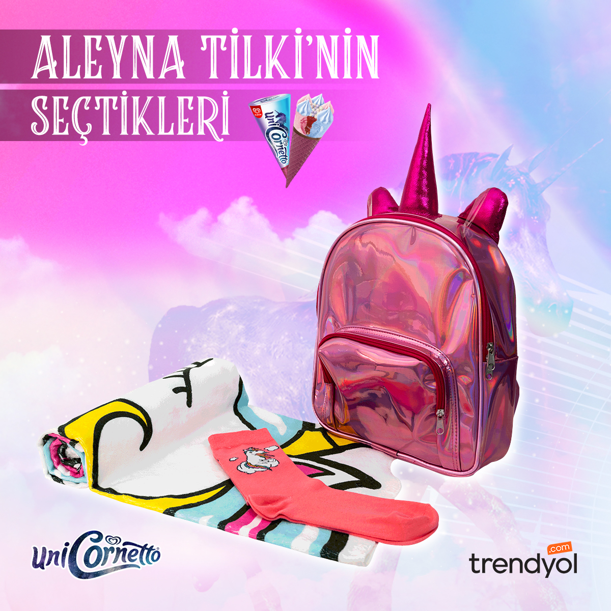 Yaza damgasını vuracak “Bu Benim Masalım” şarkısıyla UniCornetto’nun masalsı dünyasına giriş yapan Aleyna Tilki’nin seçkileri de bu özel koleksiyonda yer alıyor. UniCornetto Özel Koleksiyonu’nda yer alan birbirinden renkli ve eğlenceli ürünler arasında, Aleyna Tilki’nin tercihleri olan havlu, çorap ve sırt çantasına ek olarak saç aksesuarları, defterler, bardaklar ve telefon aksesuarları da unicorn hayranlarını bekliyor.