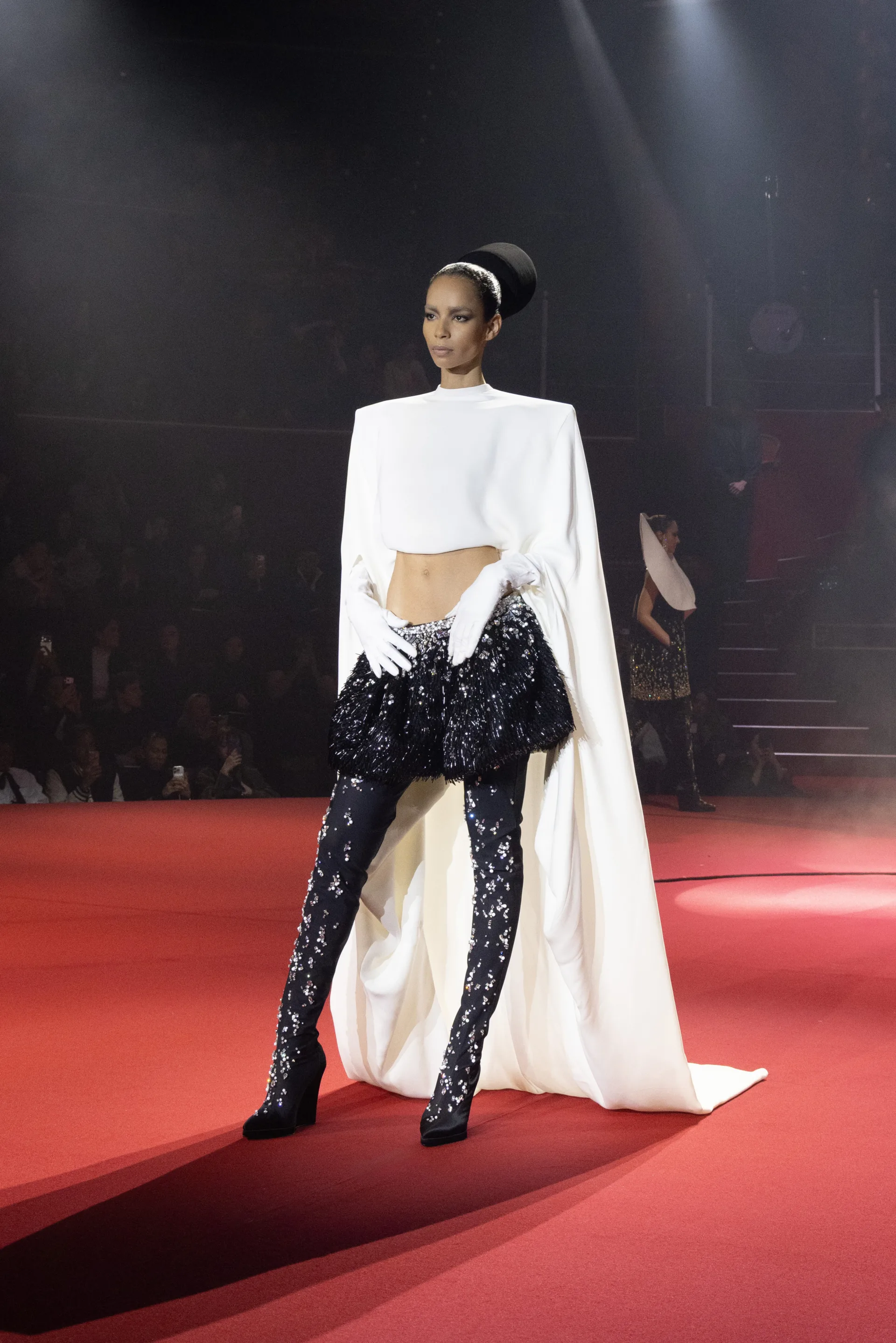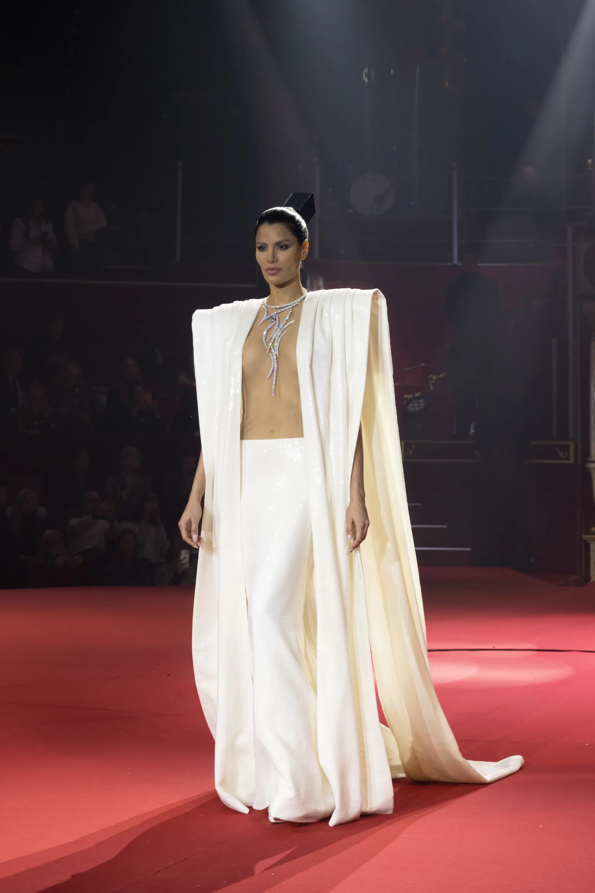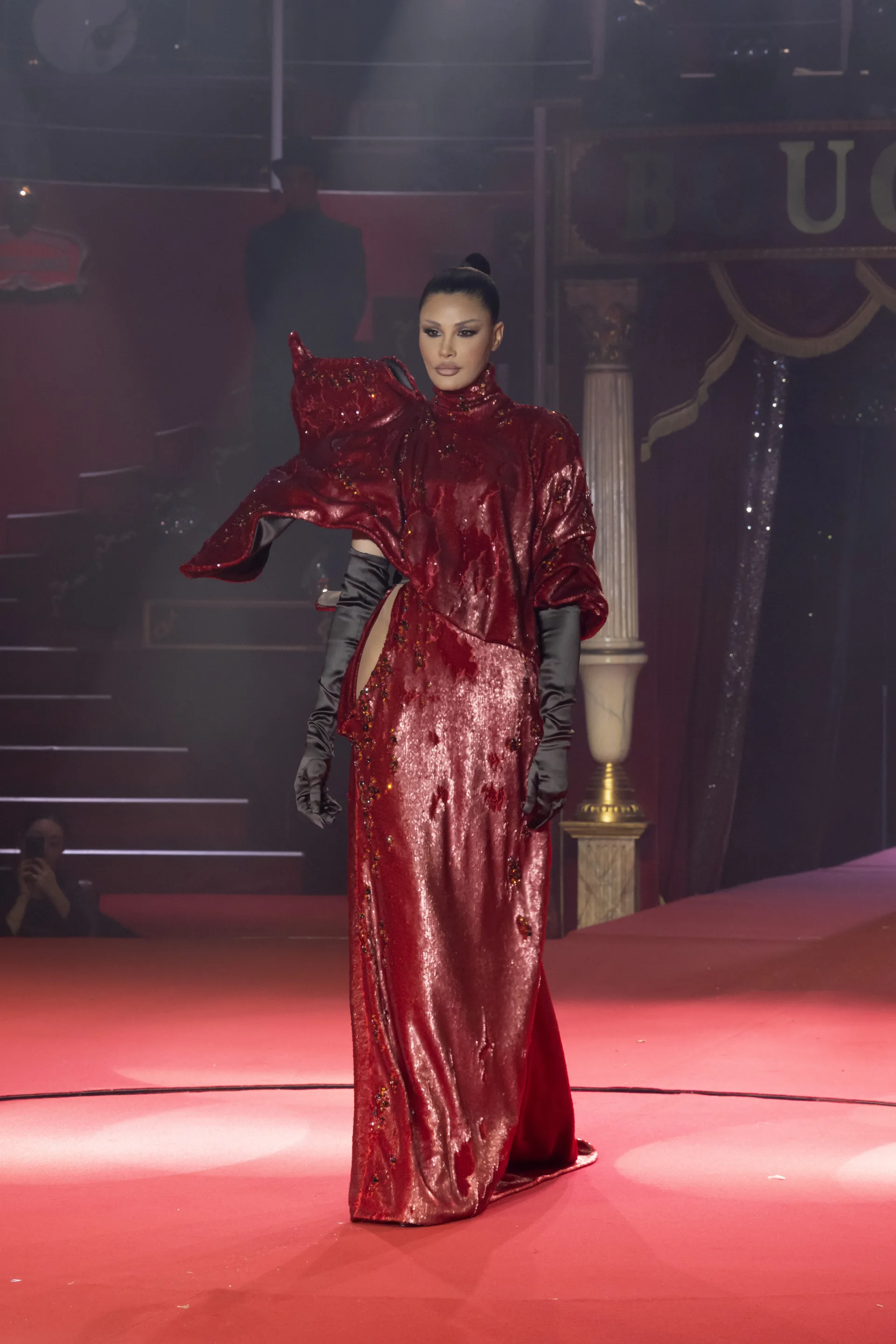 Finalden hemen önce Natalia Bouglione trapezde süzüldü. O an defile moda gösterisinden performans sanatına dönüştü. İzleyiciler gerçekten bir “Parade”in içindeydi.