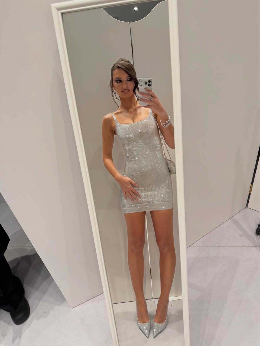 Demna’nın lookbook’ta o kadar da yer vermediği ama Milano’daki defilede tüm ilgiyi toplamayı başaran “parti kızı” konseptli bölümü. Vücudu saran, dikişsiz yüzeyler ve olabildiğine mini ya da “ön tarafı iş görüşmesi, arka tarafı parti” gibi gözüken derin dekolteli disko topu elbiseler ile öne çıkan bölüm bir konsept üretim.