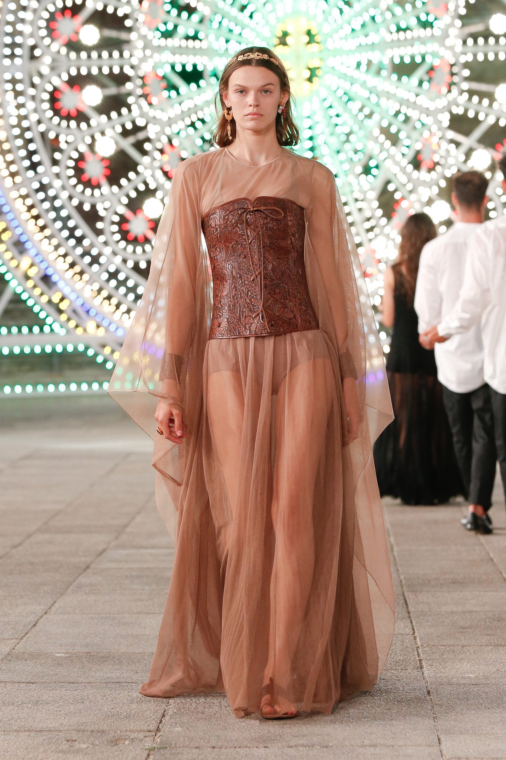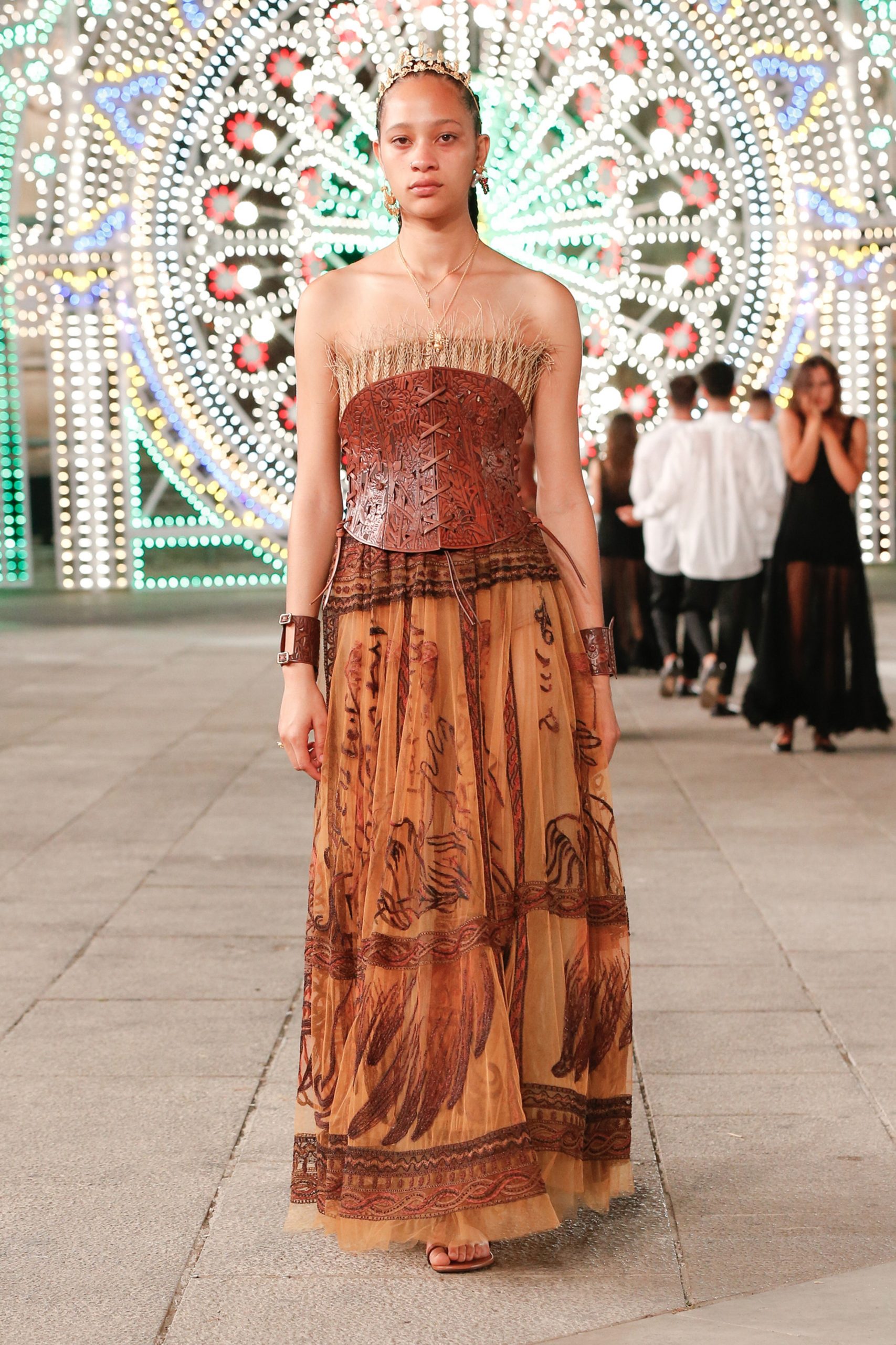 Maria Grazia Chiuri’nin “Moda rahat olmalı- bu benim DNA’mın bir parçası,” diyerek ana konseptini açıkladığı koleksiyonun kuşkusuz en dikkat çeken detayı ise birçok el yapımı doğal deri korseler.