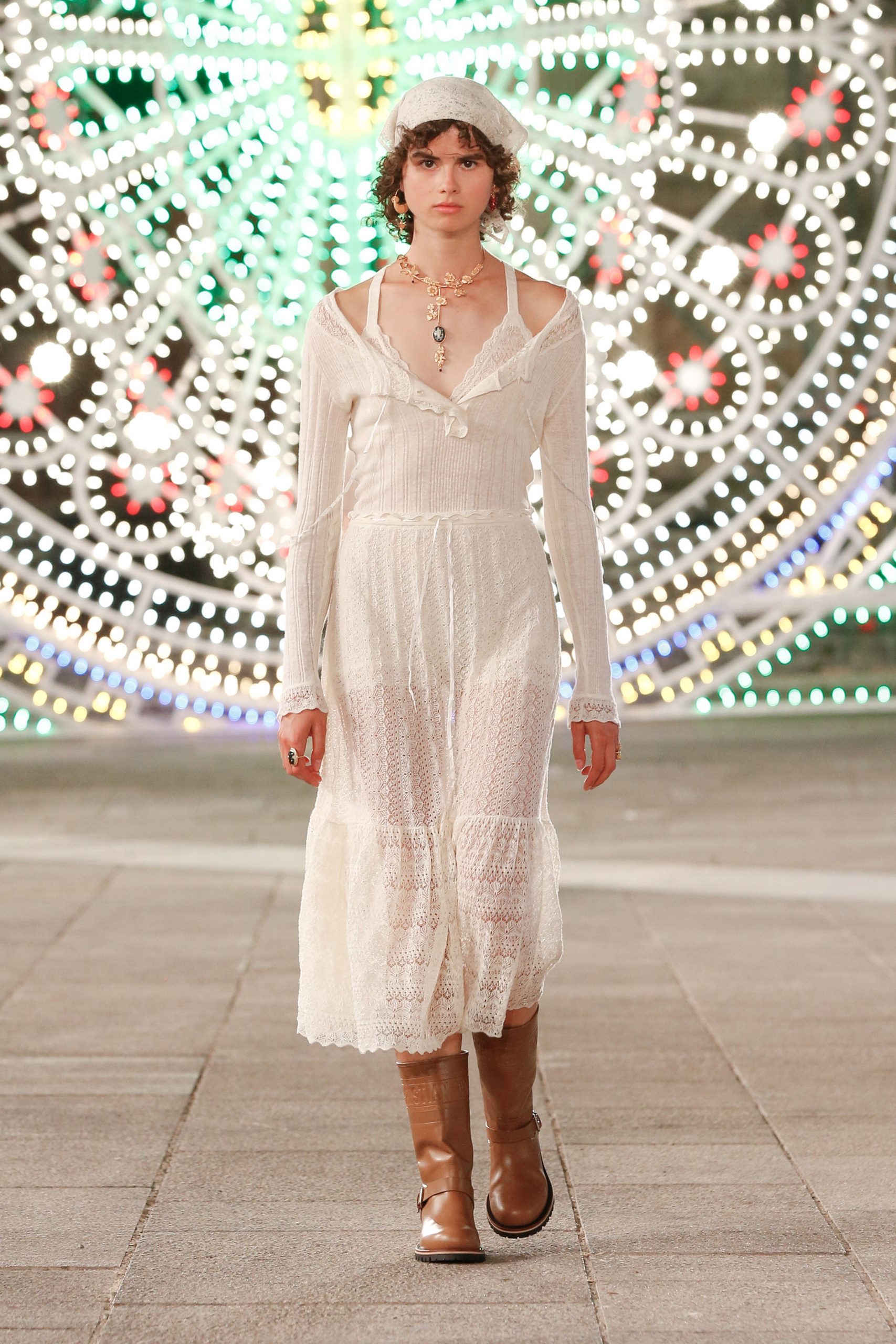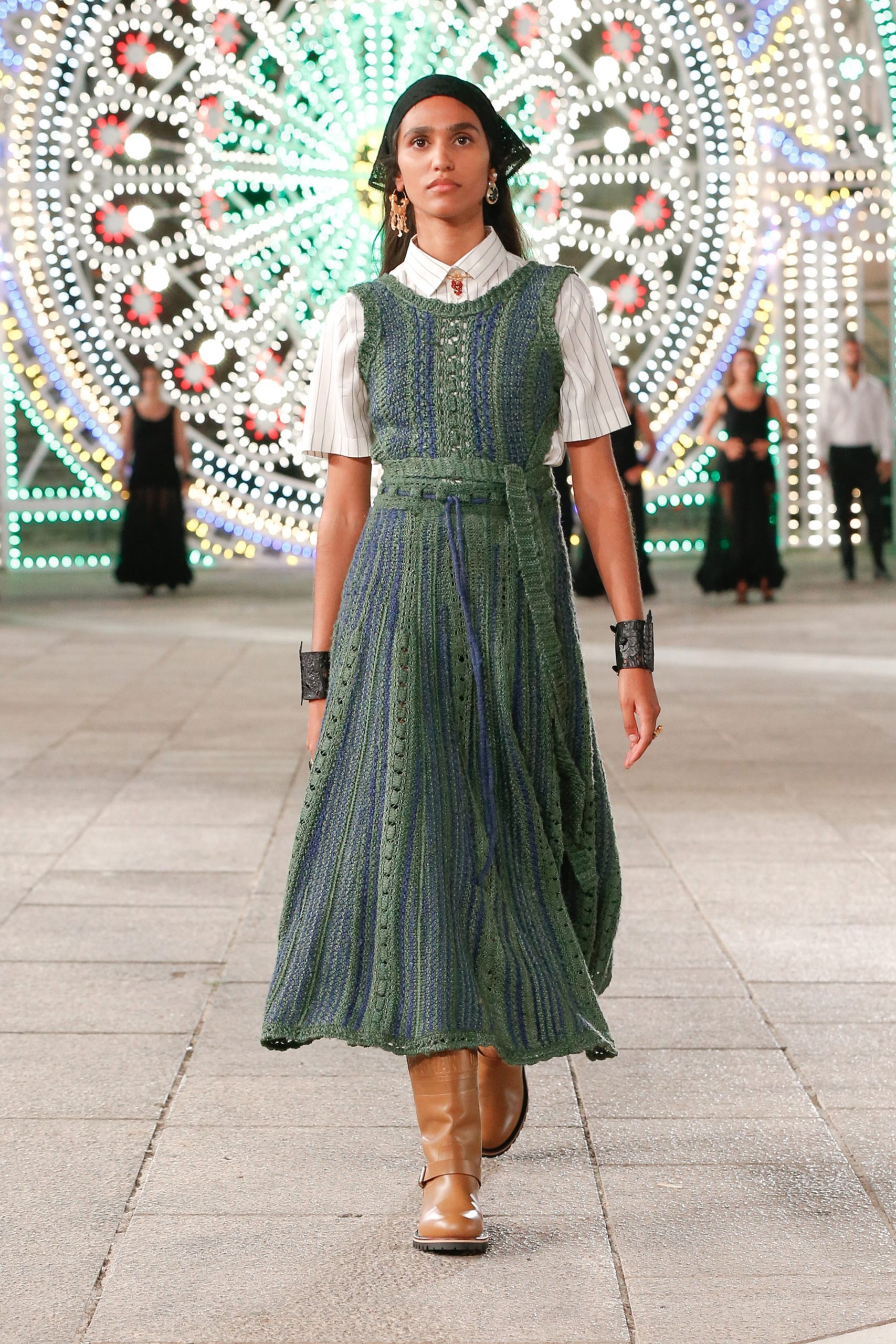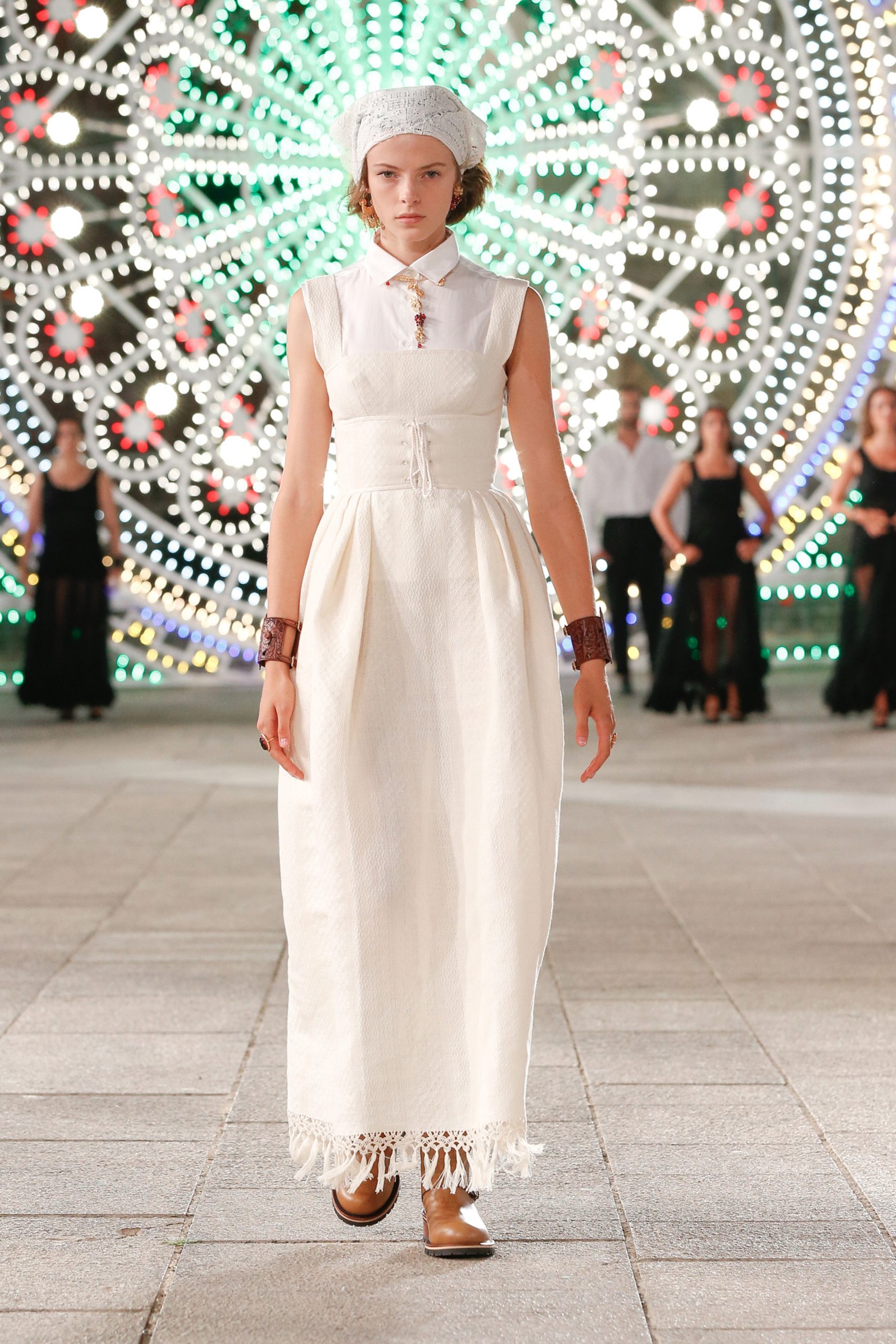 Puglia’da Piazza del Duomo’da gerçekleşen defilede; pinafore elbiseler, battaniye saçaklı etekler ve el örgüsü kazaklara bandana ve postal detayları eşlik etti.