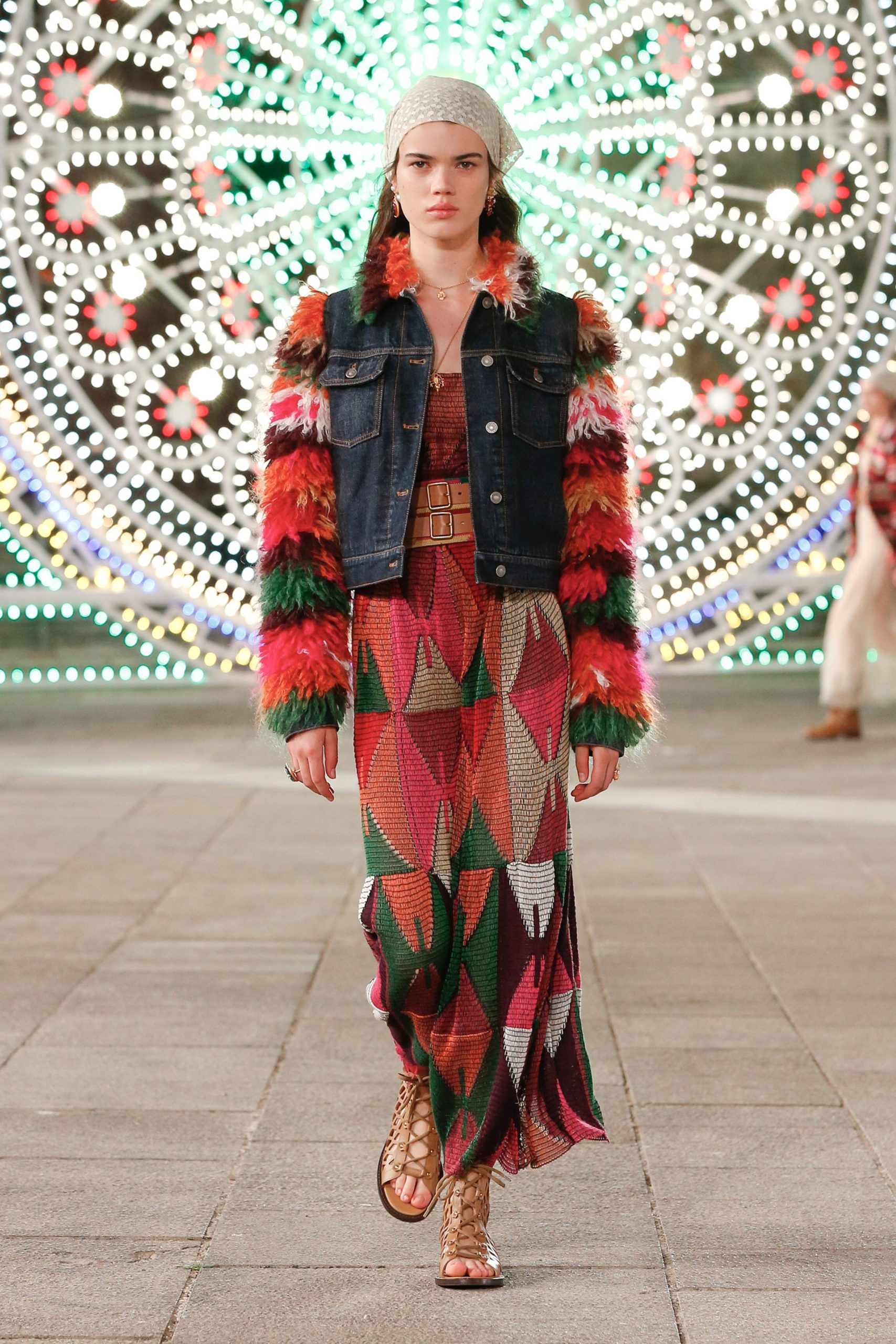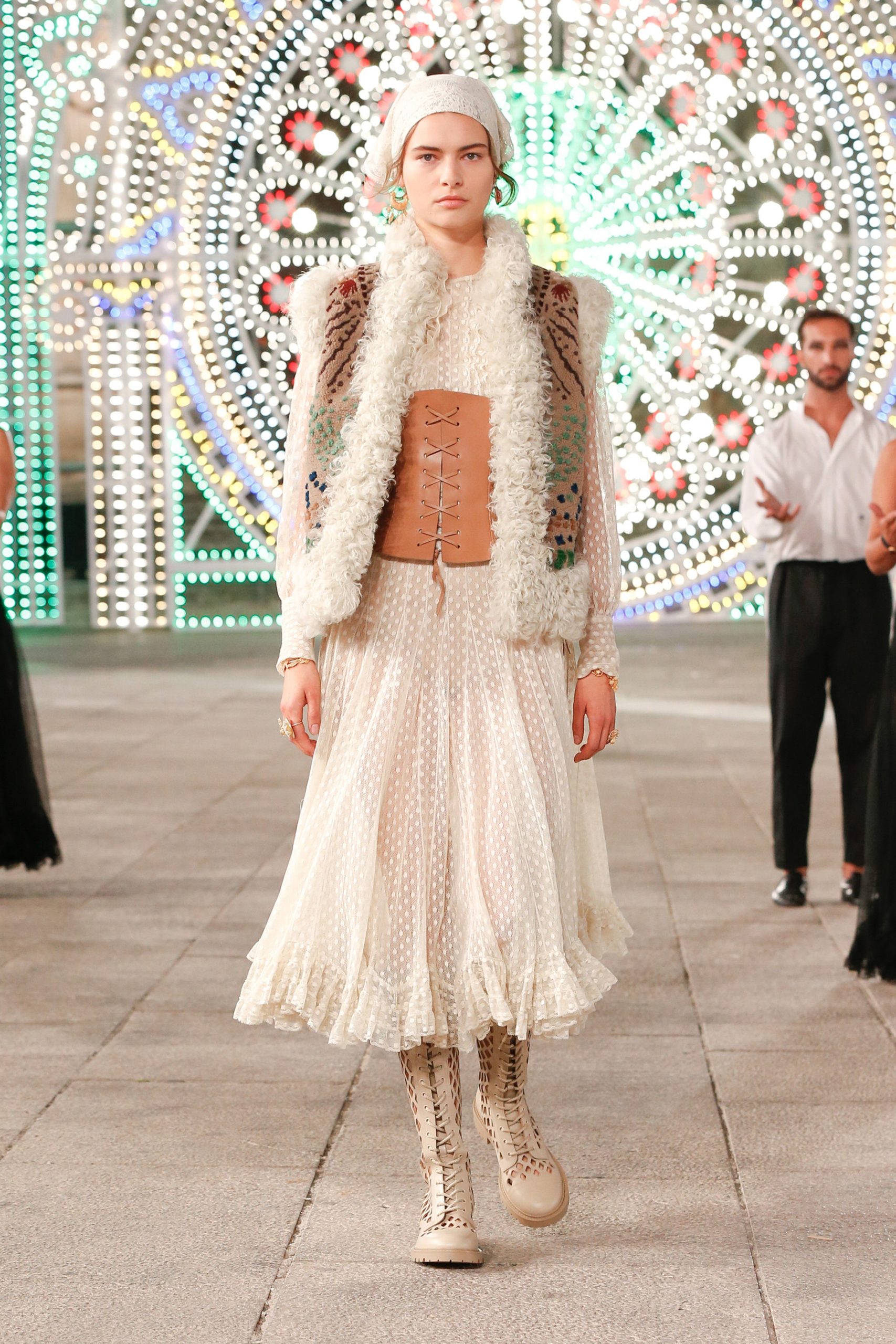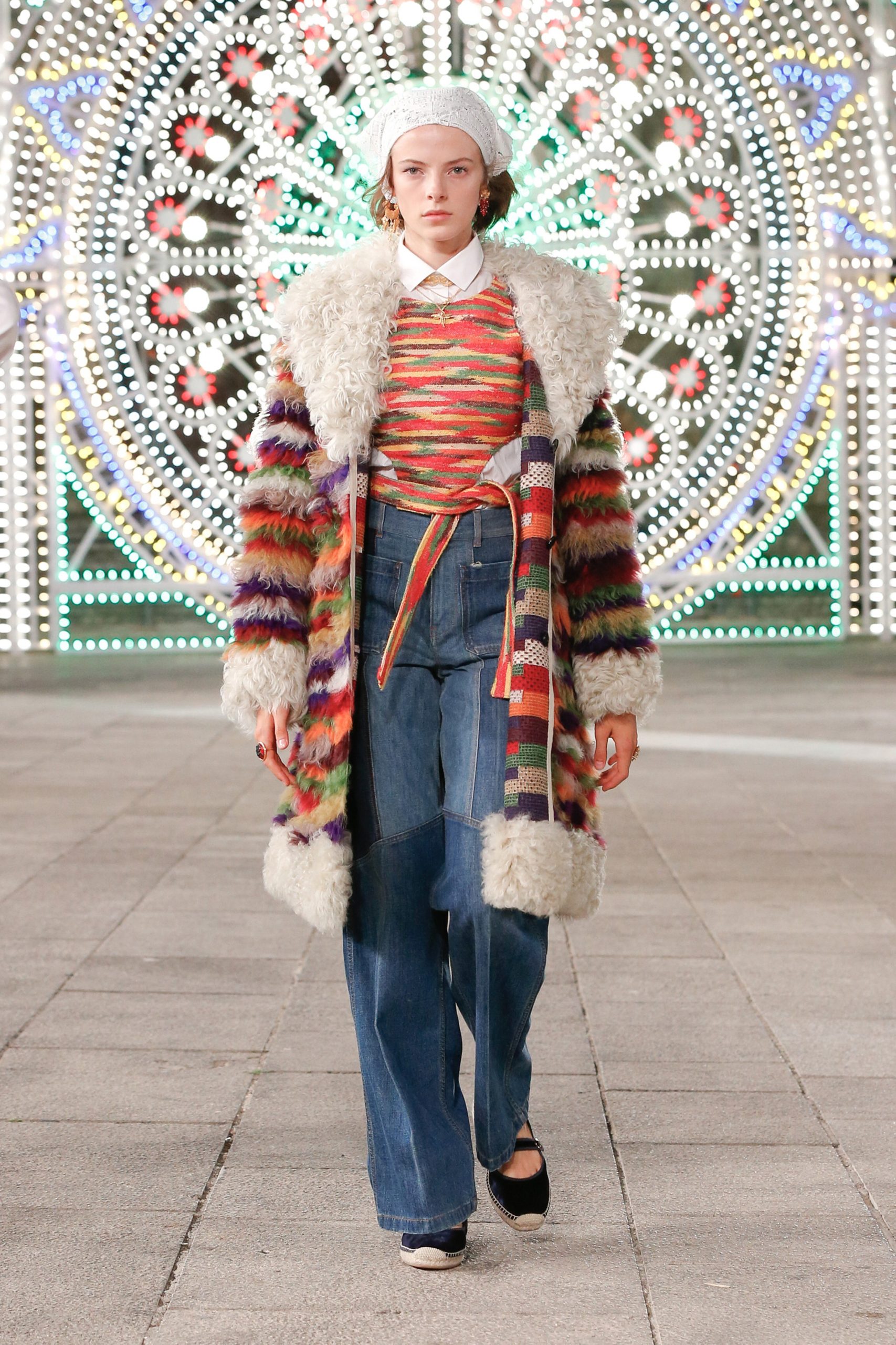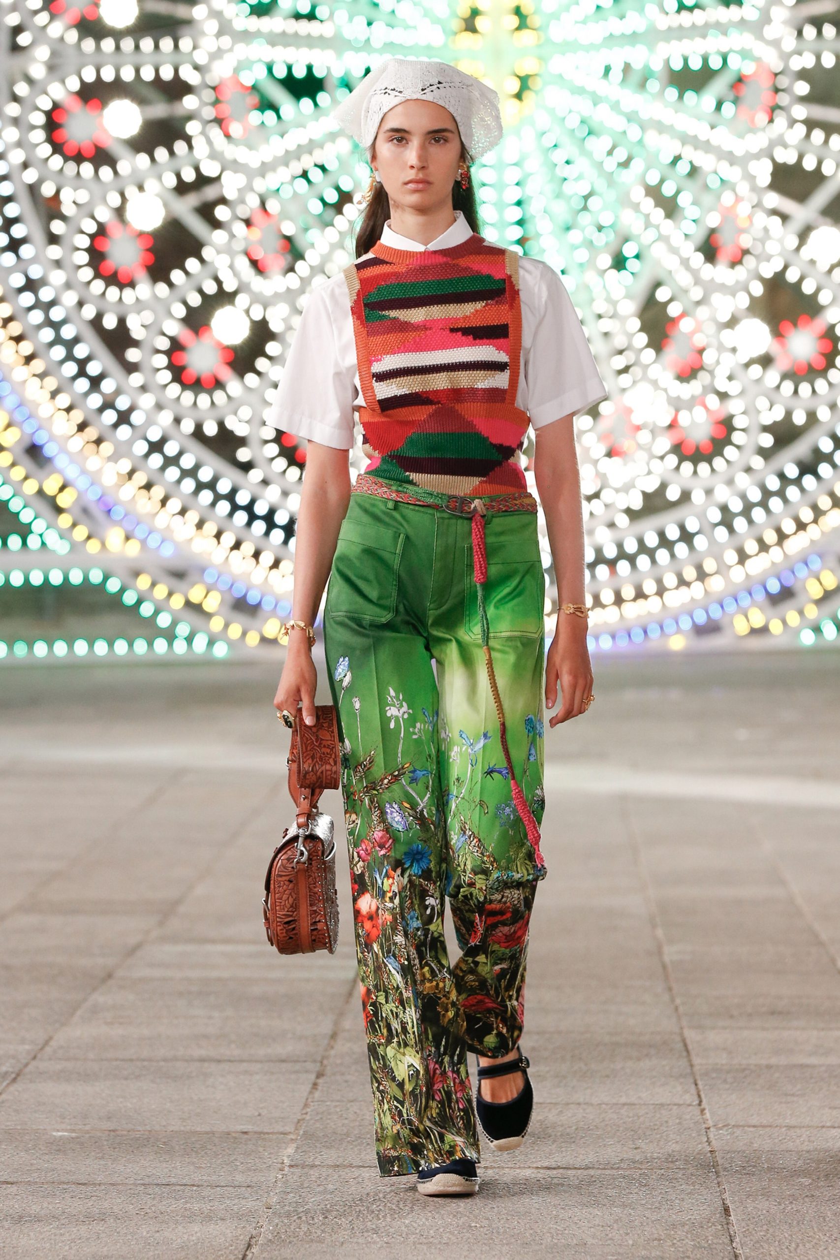 Puglia’da Piazza del Duomo’da gerçekleşen defilede; pinafore elbiseler, battaniye saçaklı etekler ve el örgüsü kazaklara bandana ve postal detayları eşlik etti.
