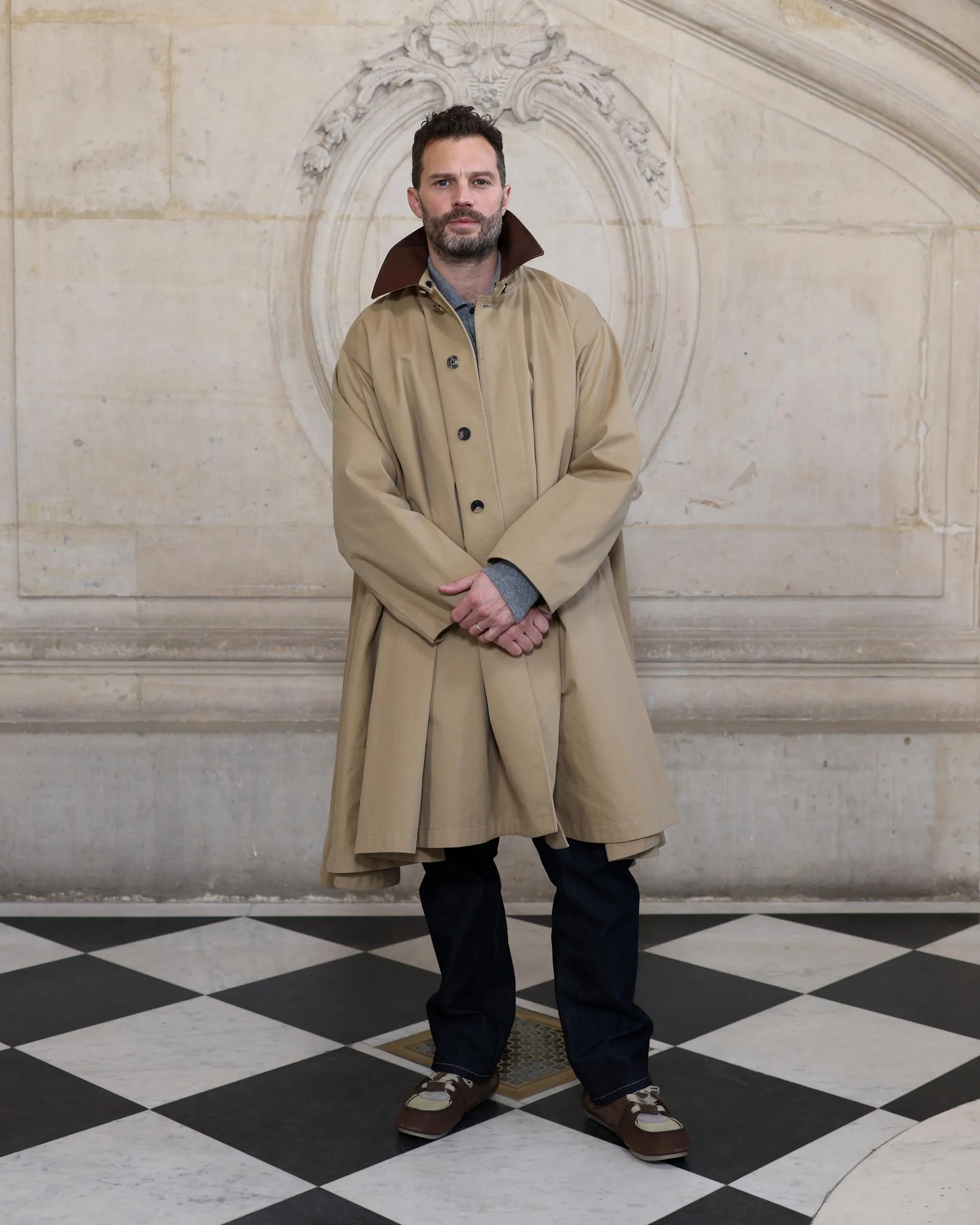 Dior bej koton trençkotu, gri kaşmir hırkası, siyah denim pantolonu ve Dior aksesuarlarıyla Jamie Dornan.