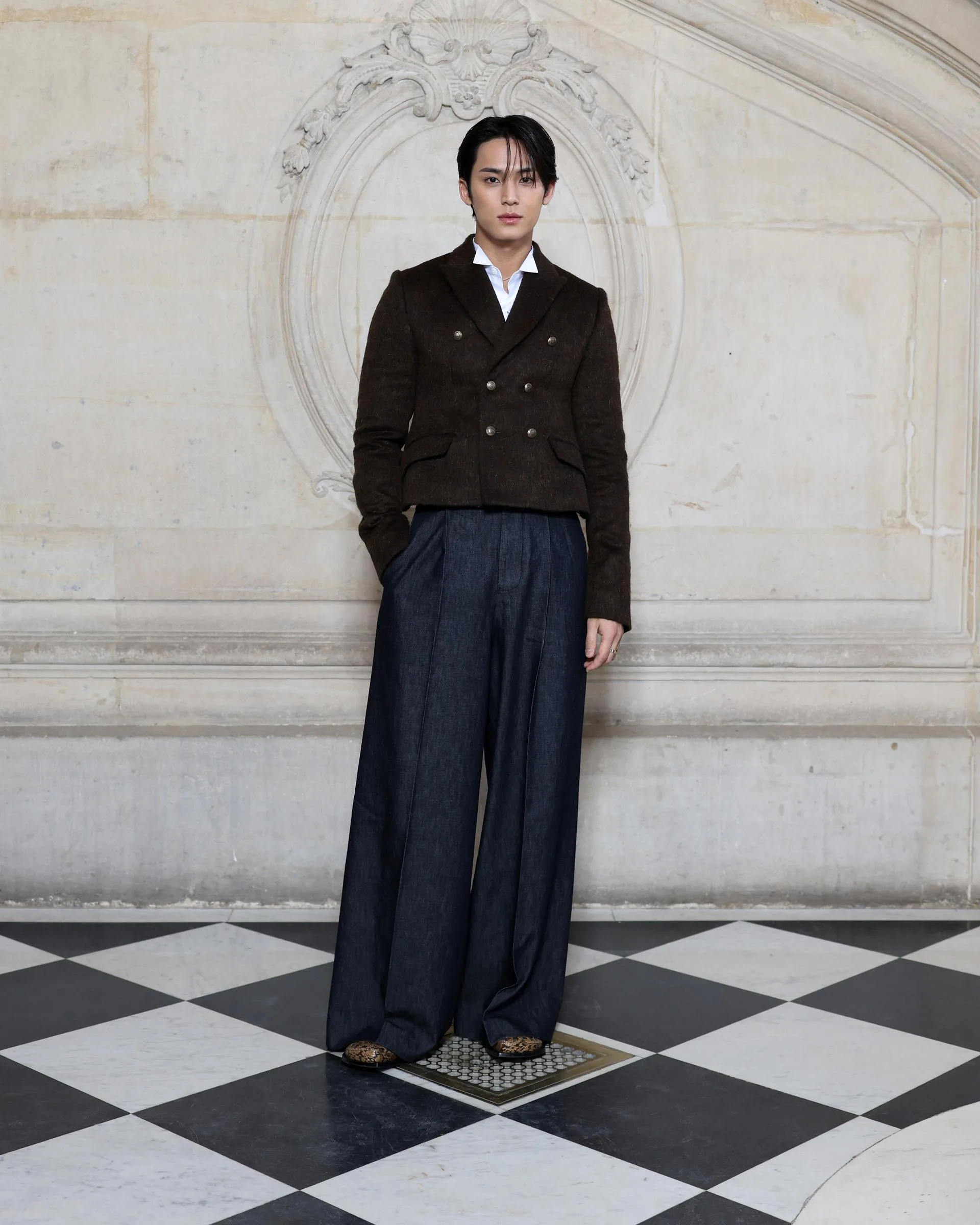 Dior kahverengi yün Bar ceketi, beyaz koton gömleği, lacivert yün pantolonu ve Dior aksesuarlarıyla Mingyu.