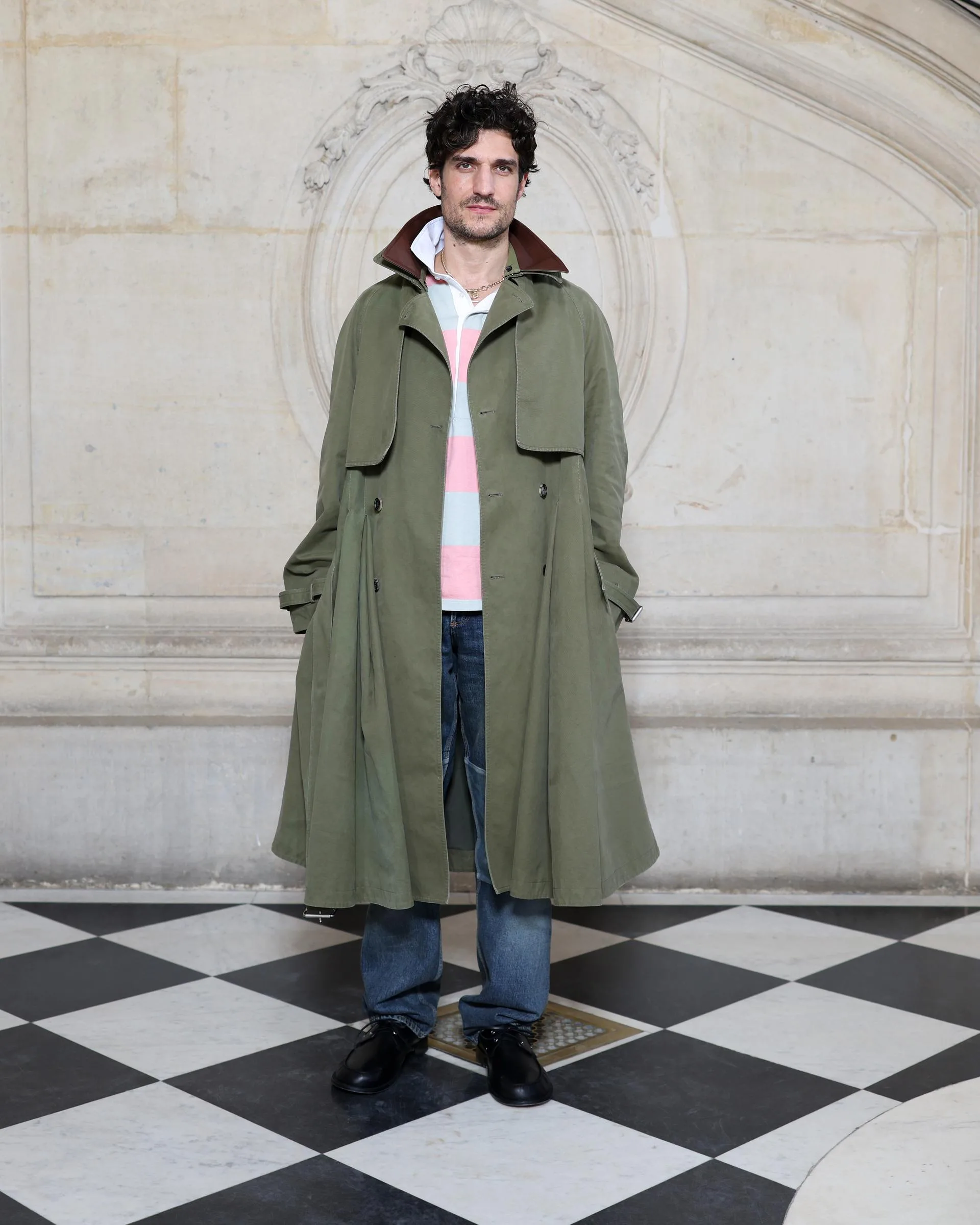 Dior haki koton pileli trençkotu, gri-pembe polo yaka üstü, denim pantolonu ve Dior aksesuarlarıyla Louis Garrel.