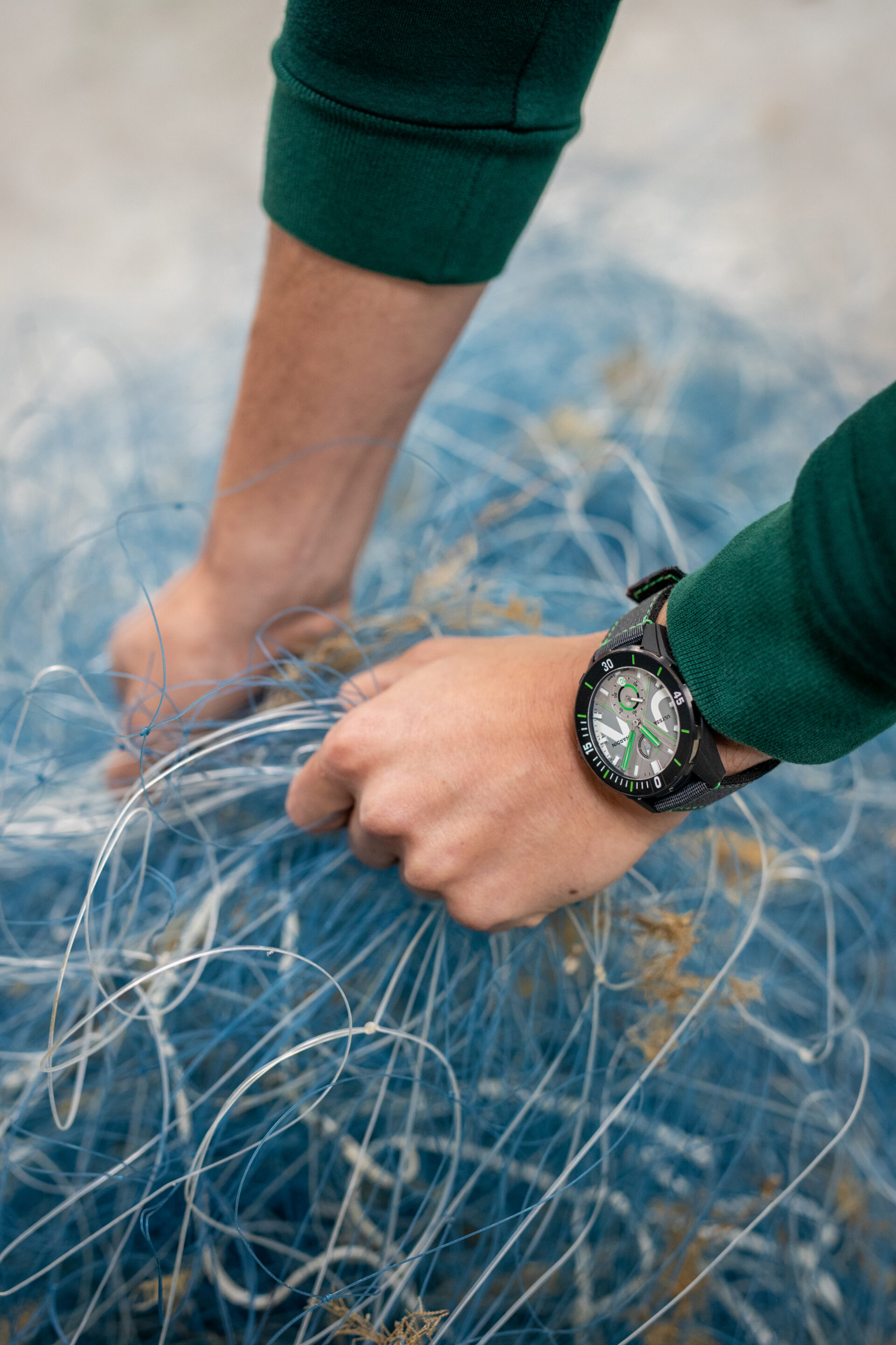 DIVER NET’in kasa, orta, arka ve bezel süslemesi için Ulysse Nardin, Fransa’da balık ağı geri dönüşüm sektörünün yaratıcısı üç Breton’lu genç tasarımcıya güveniyor. FIL&FAB, artık kullanılmayan ağları limanlardan toplayarak sürtünmeye karşı son derece dayanıklı bir hammadde olan poliamid peletlere dönüştürüyor. Bu ortaklar, ürüne karşı gerçek bir duyarlılığa sahip bir endüstriyel tasarıma ve geçiş fikrine sahipler.