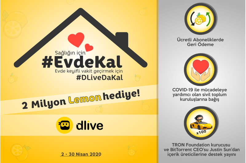 Sağlıklı kalmak için evden çıkmadığımız bu günlerde bir yandan günlük yaşantımızı evde devam ettirmeye çalışırken diğer taraftan da sürekli evde olmayı çeşitli aktivitelerle eğlenceli hale getirmeye çalışıyoruz. Çoğumuz evde nasıl keyifli zaman geçireceğimizi düşünürken DLive, topluluğunun yanında yer alarak “Sağlığın için #EvdeKal, evde keyifli vakit geçirmek için #DLiveDaKal” kampanyası ile üyelerine kazandıran bir kampanya düzenliyor. 2 Nisan’da başlayan ve 30 Nisan 2020’ye kadar devam edecek kampanya kapsamında DLive “2 Milyon Lemon” yani 160binTL hediye ediyor.