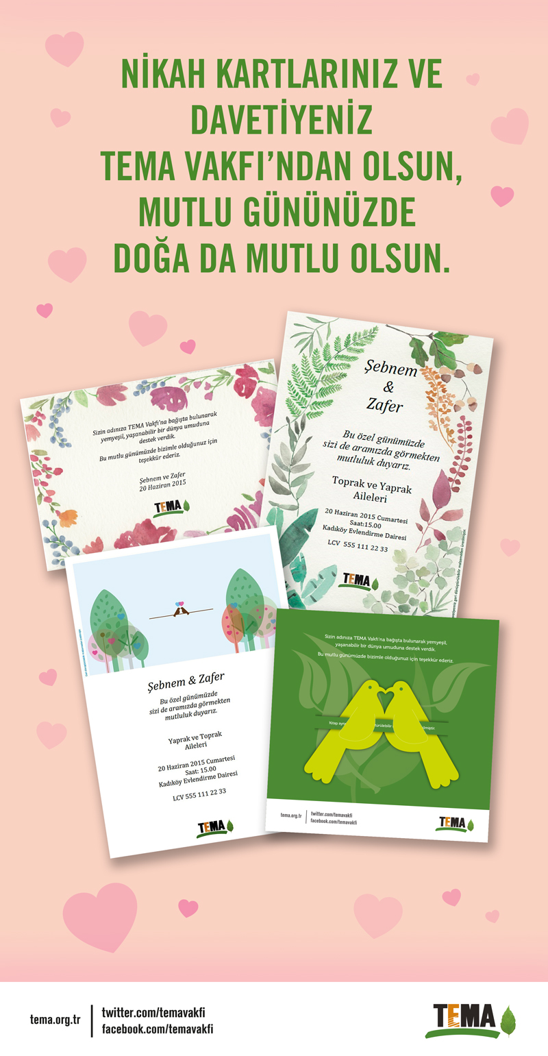 TEMA Vakfı, geri dönüştürülebilir malzemeden üretilmiş nikah ürünleri tasarladı. Nikah ürünleri, nikah şekeri yerine dağıtılabilecek nikah kartları ile davetiyelerden oluşuyor. Dünya evine adım atacak çiftler için özel olarak tasarlanan TEMA Vakfı nikah ürünlerinin Çiçekler, Yapraklar, Orman ve Kuşlar olmak üzere dört modeli bulunuyor. Yapraklar ve Çiçekler modelleri tasarımcı Bengisu Yayla tarafından TEMA Vakfı’na özel sulu boya illüstrasyon olarak hazırlandı. Kuşlar serisine ait nikah kartları aynı zamanda kitap ayracı olarak da kullanılabilecek şekilde tasarlandı. Nikah ürünlerinden elde edilen gelirle TEMA Vakfı’nın ağaçlandırma, doğal varlıkları koruma ve erozyonla mücadele faaliyetlerine katkı sağlanıyor.