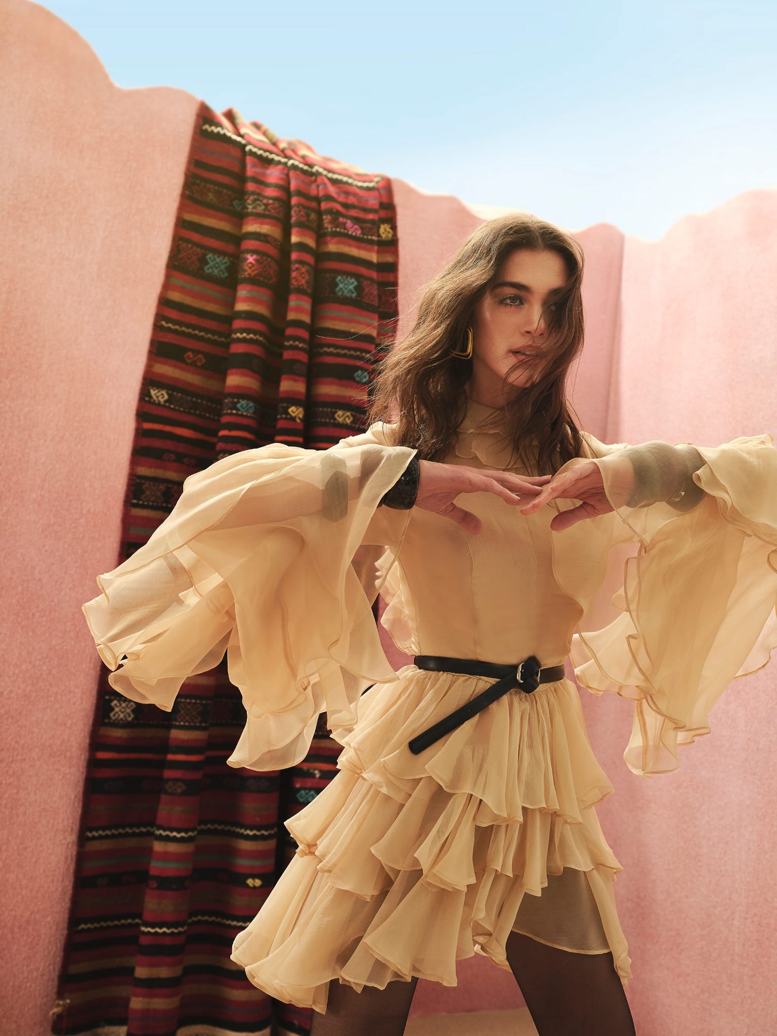 Koleksiyonun merkezinde ise zanaatın ve dokunun gücü yer alıyor. Akışkan şifonlar, sofistike muare kumaşlar ve ikat desenler; sıcak yaz akşamlarının hafifliğini ve Marakeş’in etnik ruhunu teninize taşıyor. Lüks ketenler ve zengin jakarlı dokular, Fas el işçiliğinin incelikli detaylarıyla buluşuyor. Parıltılı pul, payet ve boncuk işlemeler ise güneş ışığında ışıltı saçan saray tavanlarını çağrıştırıyor.