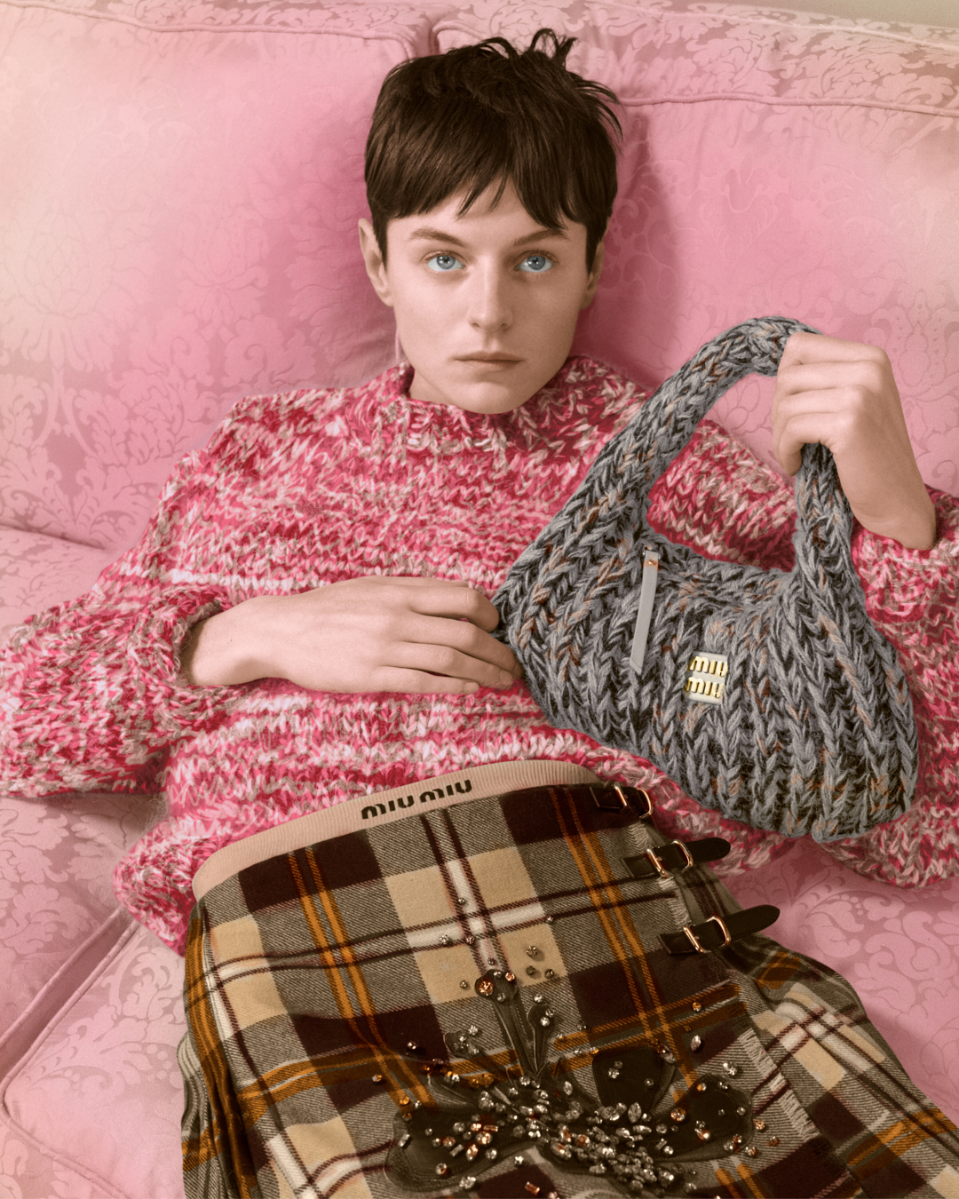 Miu Miu yenilikçi tasarımı, endüstriyel mükemmeliyetle birleştiriyor; her bir parçanın titizlikle ve ustalıkla tasarlandığı yüksek kaliteli giysiler ve aksesuarlar üretiyor. Miu Miu Upcycled iplik, el örgüsü melanj yünden, konforlu ve sıcak tutan giysiler yaratmak için dönüştürülüyor. Tüm parçaları pamuklu tığ işi Miu Miu logosu ile tamamlanan koleksiyon; kalın yuvarlak yaka kazaklar, kapüşonlular, şallar ve küçük aksesuarlar içeriyor. Wander çanta ve örme terlikler, sezonlar boyunca keyifle kullanılacak cesur ve alışılmışın dışında bir koleksiyonu tamamlıyor.