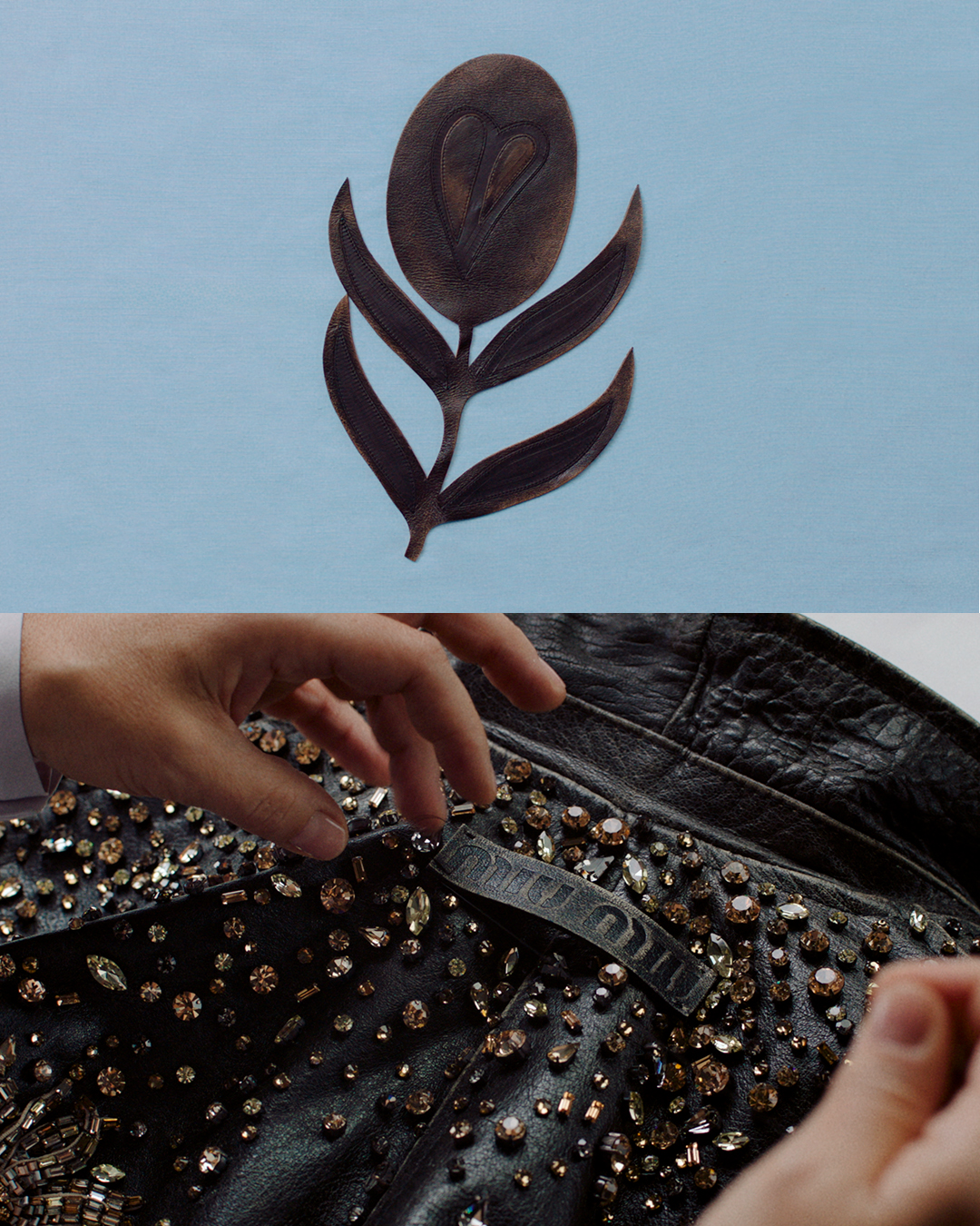 Miu Miu Upcycled deri, 2022 Sonbahar/Kış sezonunda tanıtılıyor. 2024 için ise vintage motorcu ceketler, markanın imza şortları ve mini etekleriyle kombinleniyor, ikonik malzemeler ekleniyor. Bunun yanı sıra Miu Miu’nun 2011 İlkbahar/Yaz defilesinden ilham alarak çiçek ve alev motifleri içeriyor, ayrıca Miu Miu 2024 Sonbahar/Kış koleksiyonundan mücevherli desenler de yer alıyor. Her ceketin orijinal yapısı değiştiriliyor ve yeniden ustaca şekillendiriliyor, saten astarla kaplanıyor, dikişli korse detayları ekleniyor. Fermuarlar yeniden konumlandırılıyor, etekler işlenmemiş bir şekilde bırakılıyor ve Miu Miu logosu ceketin üstüne el işçiliği ile özenle işleniyor.