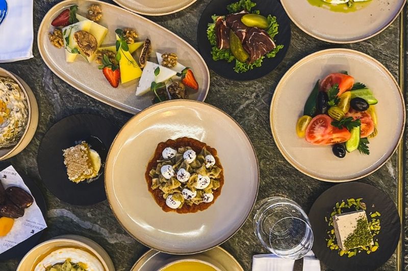 İzmir tulum peyniri, tereyağı, pastırma, hurma, tahin helvası gibi iftariyeliklerin vazgeçilmezleri ile başlayan menüde başlangıçlarda, mercimek çorbası, biber borani, humus, isli patlıcan, ara sıcaklarda içli köfte, mantı, su böreği, ana yemekte saray pilavı ve kuzu pirzola, piliç Topkapı ve isli patlıcan beğendi, adaçayı ile buharda pişmiş somon ve krema sos eşliğinde aspir otlu patates püresi gibi zengin seçenekler misafirlere sunuluyor.