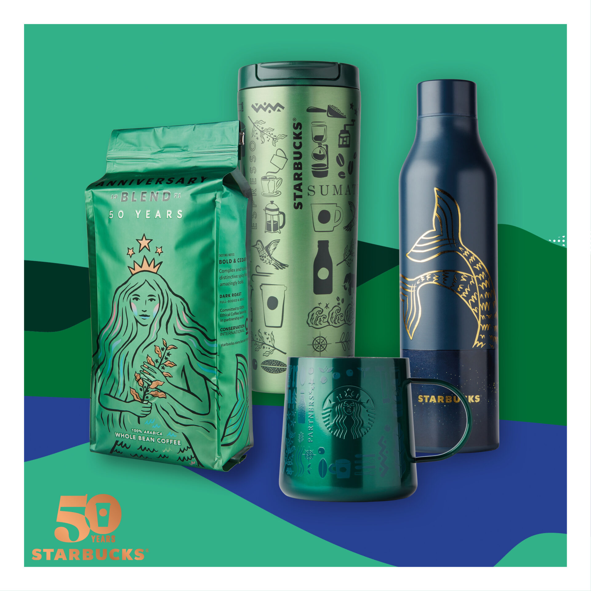 Starbucks’ın yeni yaşına özel tasarlanan Siren kızı desenlerinin ve 50. yıl logosunun da yer aldığı kupa, termos ve fincanlar Starbucks mağazalarında ve Hepsiburada ’da markanın tutkunu koleksiyonerleri bekliyor.