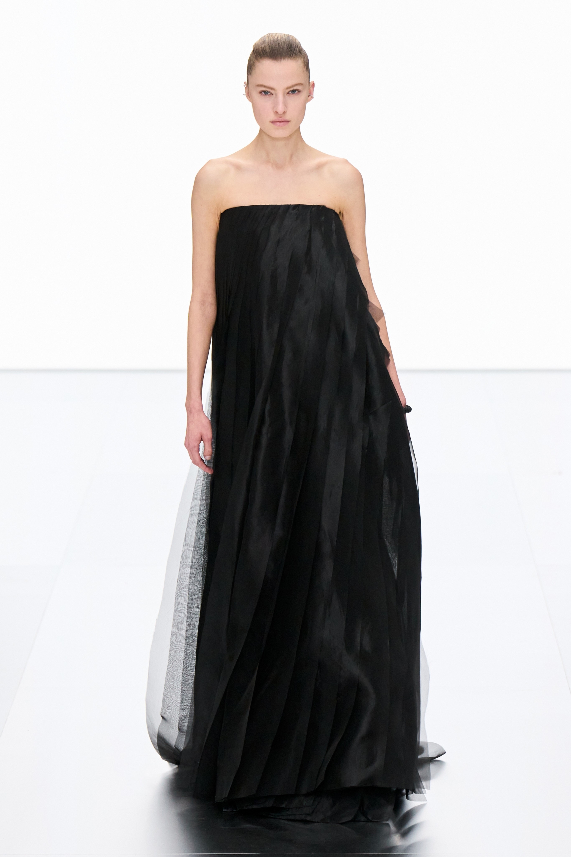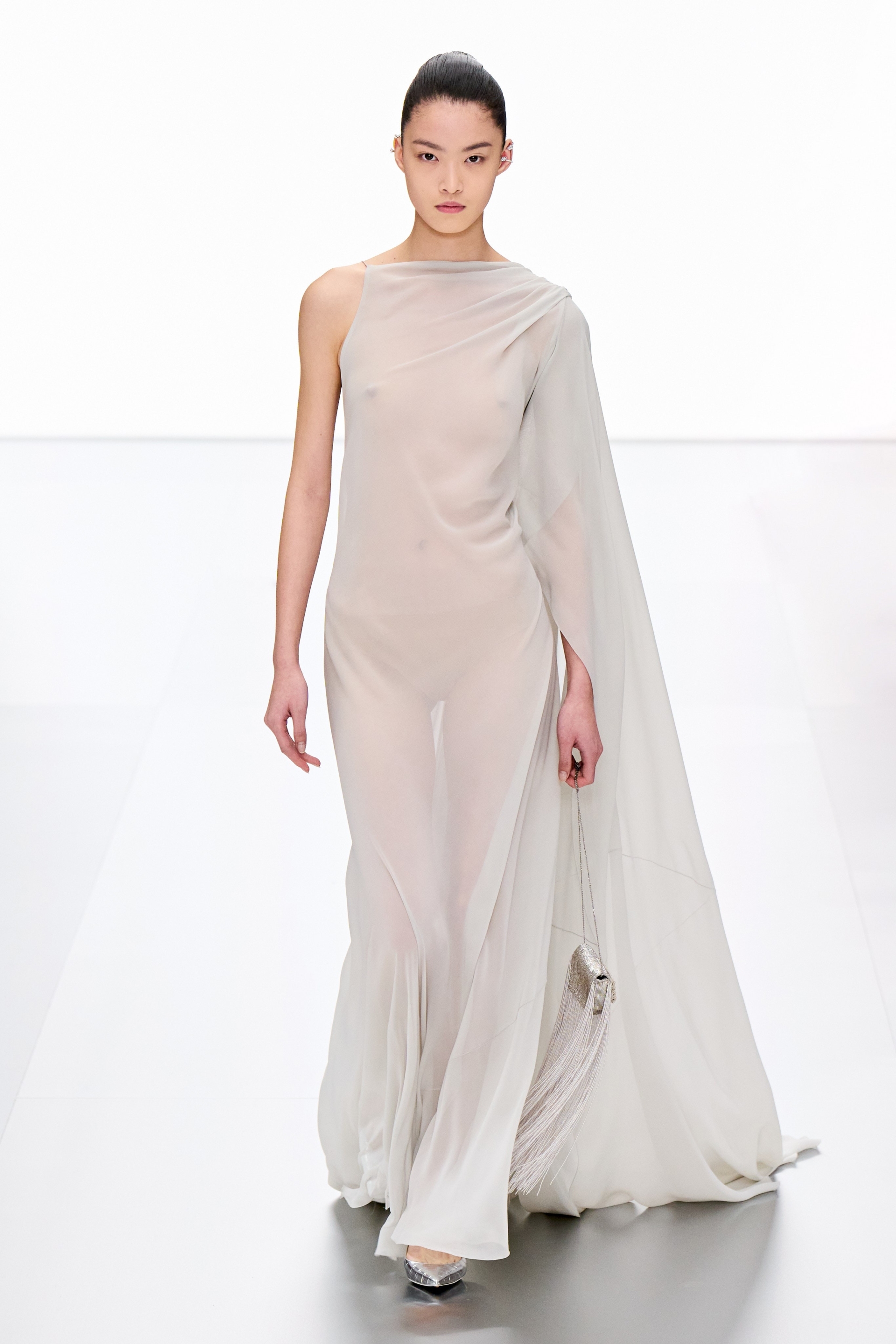 Koleksiyonun bir diğer öne çıkan özelliği ise ‘Roma etkisi’ altında şekillenen bir anlatı sunmasıydı. Heykelsi zarafetin ön plana çıktığı ‘Scatola’ silueti, geometrik desen kesiminden doğan yeni hacimlerle dolup taşarken, kumaş seçimleri ve terzilik detaylarıyla dikkat çekiyordu. Usta nakış işçiliği, koleksiyonun göz alıcı bir parçası haline gelmişti. Boncuk ve payet detayları, özellikle bir elbisenin komplike dokusunda ve ışıltılı incelikte kendini gösteriyordu. Bu detaylar, koleksiyonun tasarım ve dekorasyonun mükemmel bir birleşimi olduğunu gösterirken, gelecekteki tasarımlarda orijinal dokusuyla deri kullanımına dikkat çekiyordu. Göz dolduran unsurlarından bir diğeri ise, şeffaflıkla oynayan tasarımlar ve süslemelerdi. Bu tasarımlar, gizli ve görünürün dansını, kumaş ve derinin zarif bir uyumuyla birleştirerek gece giyiminde yeni bir çağın kapılarını araladı. Couture’un sınırlarını zorlayan koleksiyon, erkeksi terziliği kadınsı akışkanlıkla birleştiren ikilikleri ortaya koydu. Yıkanmış ipeklerden yapılan günlük giyimden, geleneksel güç simgesi kıyafetlerin modern yorumlarına kadar, koleksiyon kullanışlılık ve lüksün mükemmel bir kombinasyonunu sergiledi.