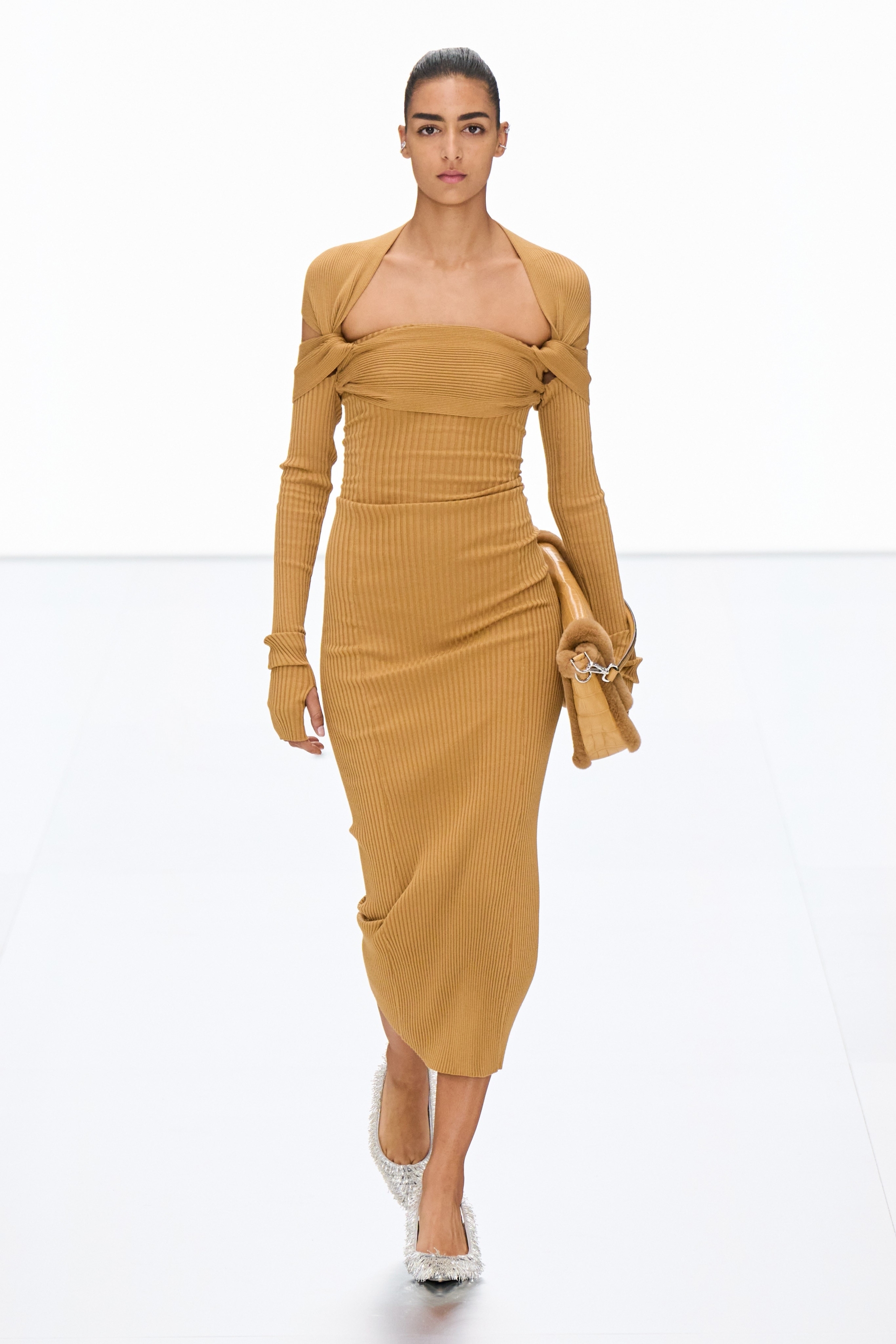 Kreatif direktör Kim Jones’un gösteri notlarından alıntı yaparak başlayalım; “Bu geleceğin kalbinde hümanizm var” ifadesi, koleksiyonun temelini atıyor. İlhamın kaynağı, Karl Lagerfeld’in İtalyan markadaki etkileyici mirasıydı ve Jones’un cesur fütürizm vizyonu, Paris’in tarihi Palais Brongniart’ta gerçekleşen şovda yaşam bulmuştu. Koleksiyon, çoğunlukla siyah tonlardan oluşan, vücut hatlarını saran sade, minimal siluetlerle başlıyor. Ortaya çıkan açık tonlardaki tasarımlar, gümüş metalik detaylarla bezenmiş, zarif ve sofistike bir dönüş yaparak izleyenleri büyülüyor. Koleksiyonun temel teması, “gösterişten kaçınmak” ve “zanaat ile pratikliği merkeze almak” üzerine kurulu.