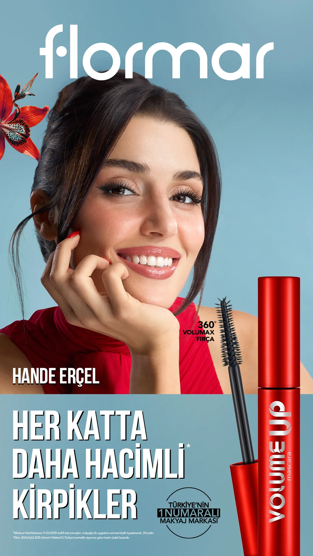 Türkiye’nin bir numaralı makyaj markası* Flormar, yeni global marka yüzü “Hande Erçel” ile Volume Up Mascara’yı sunar: Güzelliği ve stili ile global ölçekte dikkat çeken ünlü oyuncu Hande Erçel’in yer aldığı reklam kampanyası, her katta hacim ve lifting etkisi sunan Volume Up Mascara’yı izleyiciyle buluşturuyor.
