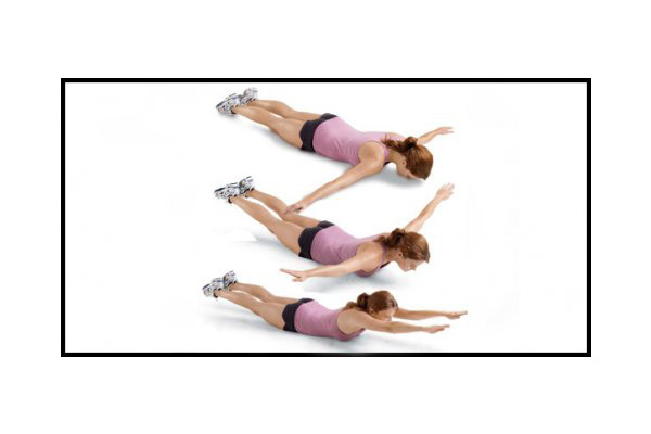 Yüzüstü yere uzanıp kollarınızı omuz hizasında iki yana uzatın ve dirseklerinizi hafifçe kırın (a). Kürek kemiklerinizi birbirine yaklaştırıp kollarınızı, gövde ve bacaklarınızı yerden kaldırın (b). Pozisyonu korurken kollarınızı ileri doğru uzatın (c). Kollarınızı tekrar geri alıp gövdenizi yere bırakın. 10–15 kez tekrarlayın.