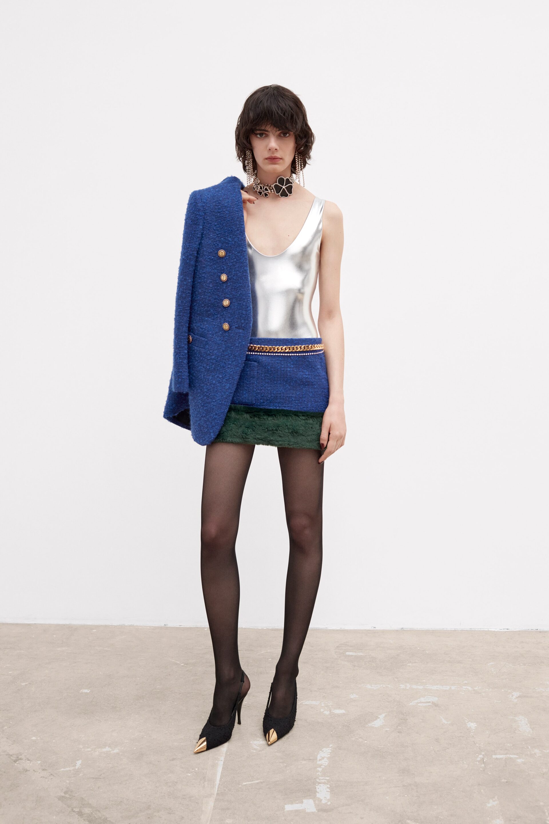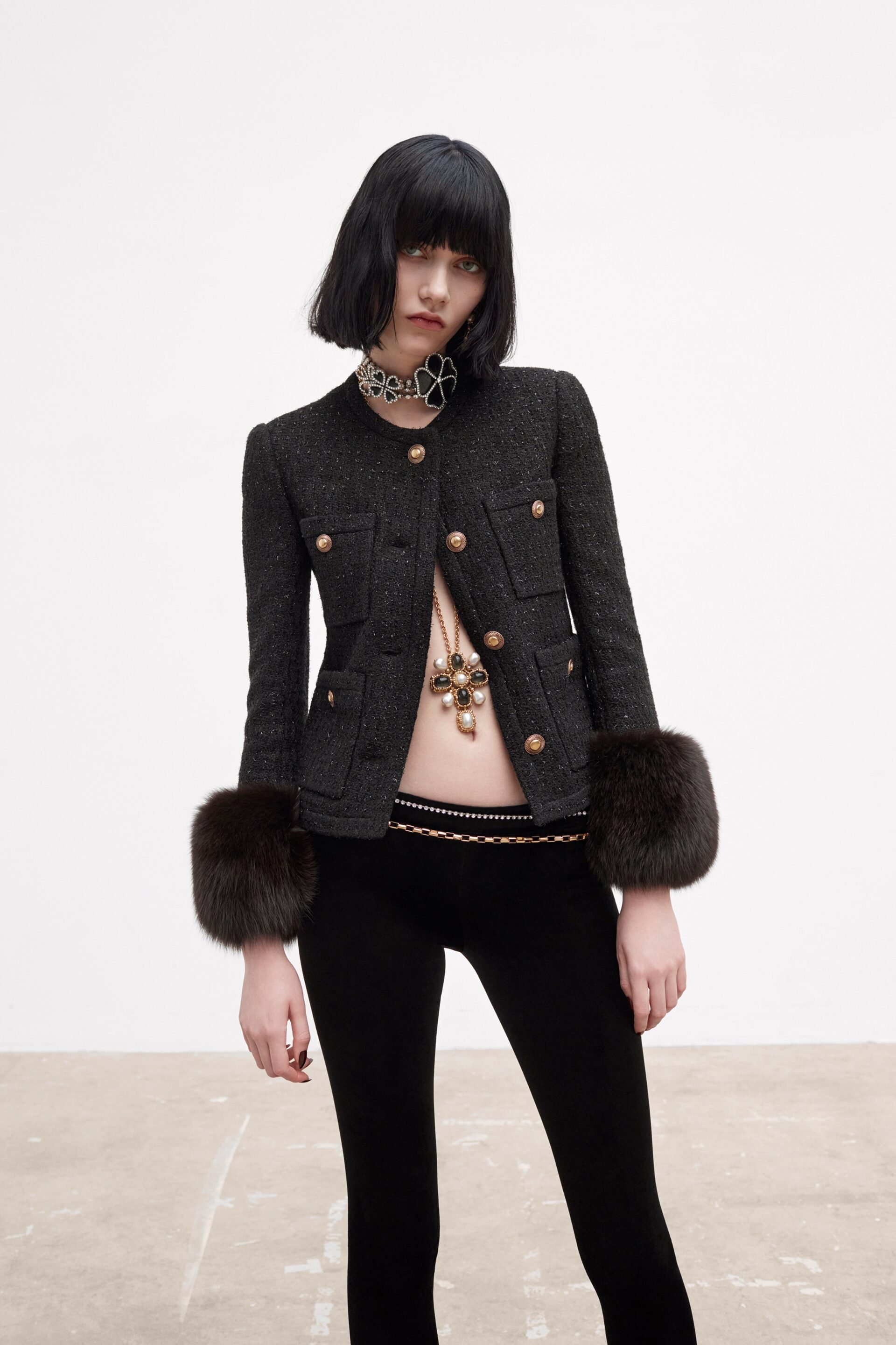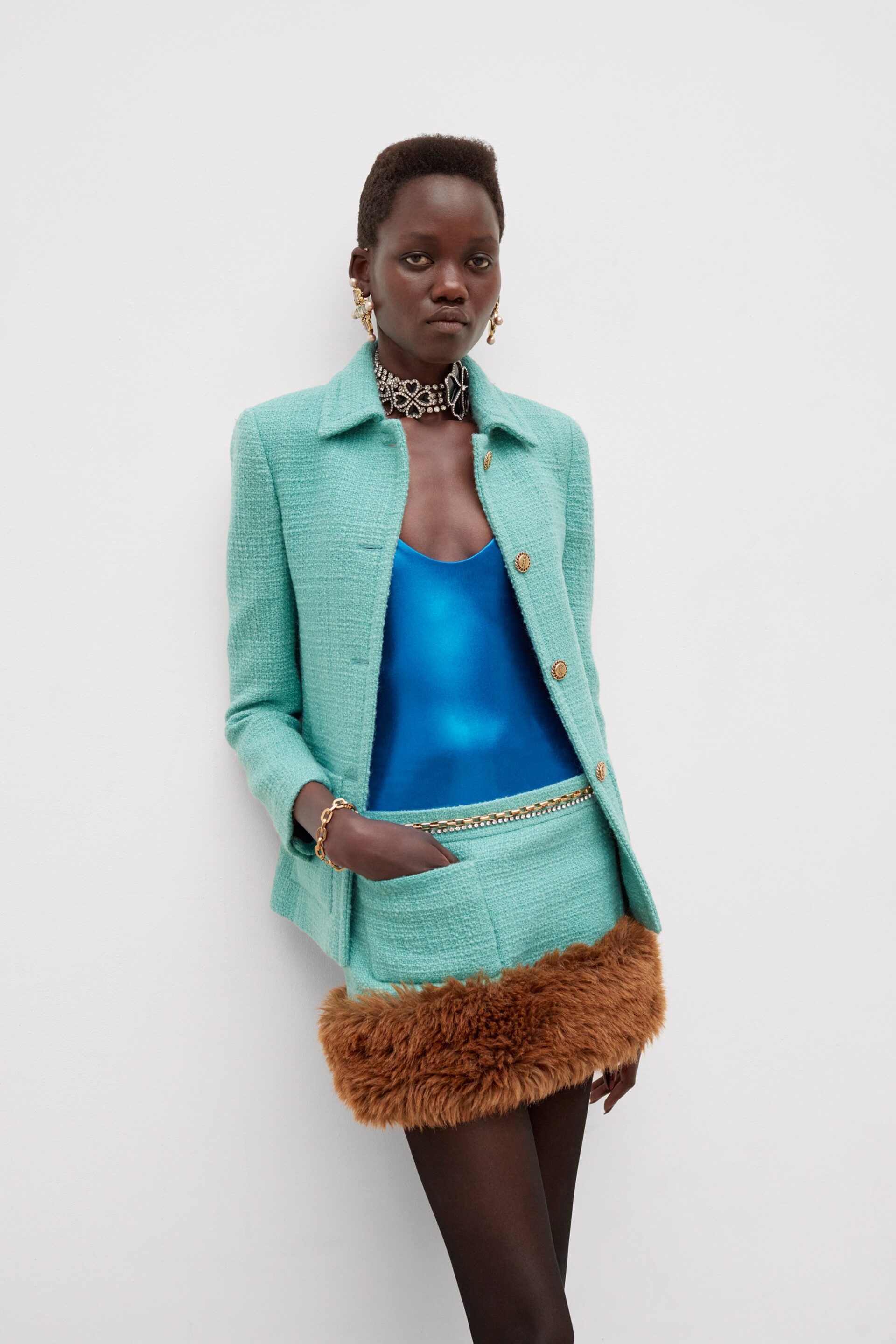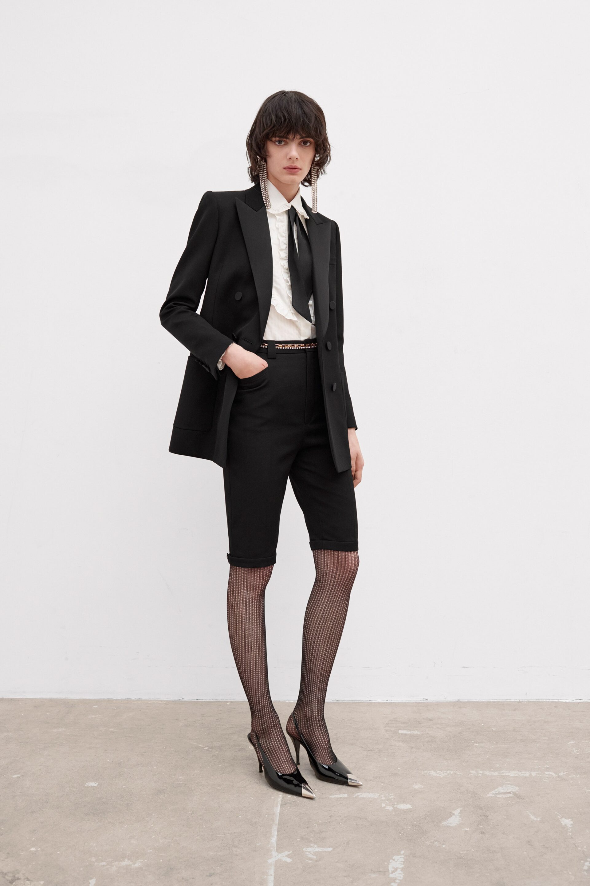 Bu kez Mösyö Saint Laurent’in erkek giyim kumaşlarında kullandığı klasik ve zarif, 60’ların ortalarındaki dokulara dikkat çekilen koleksiyonda yine Saint Laurent’in tercih ettiği monokromatik palet; bu kez menekşe, kobalt, altın ve şartröz sarısı ile zenginleşiyor. Vaccarello bu formülü “60’ların şekilleri ve 80’lerin renkleri” olarak tanımlıyor.