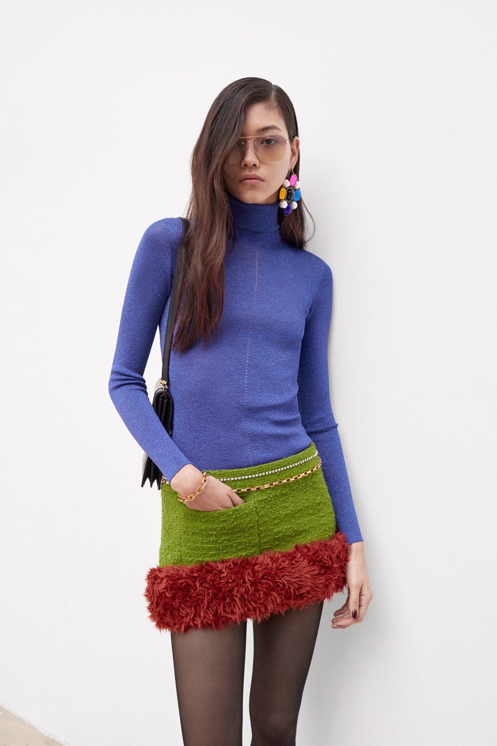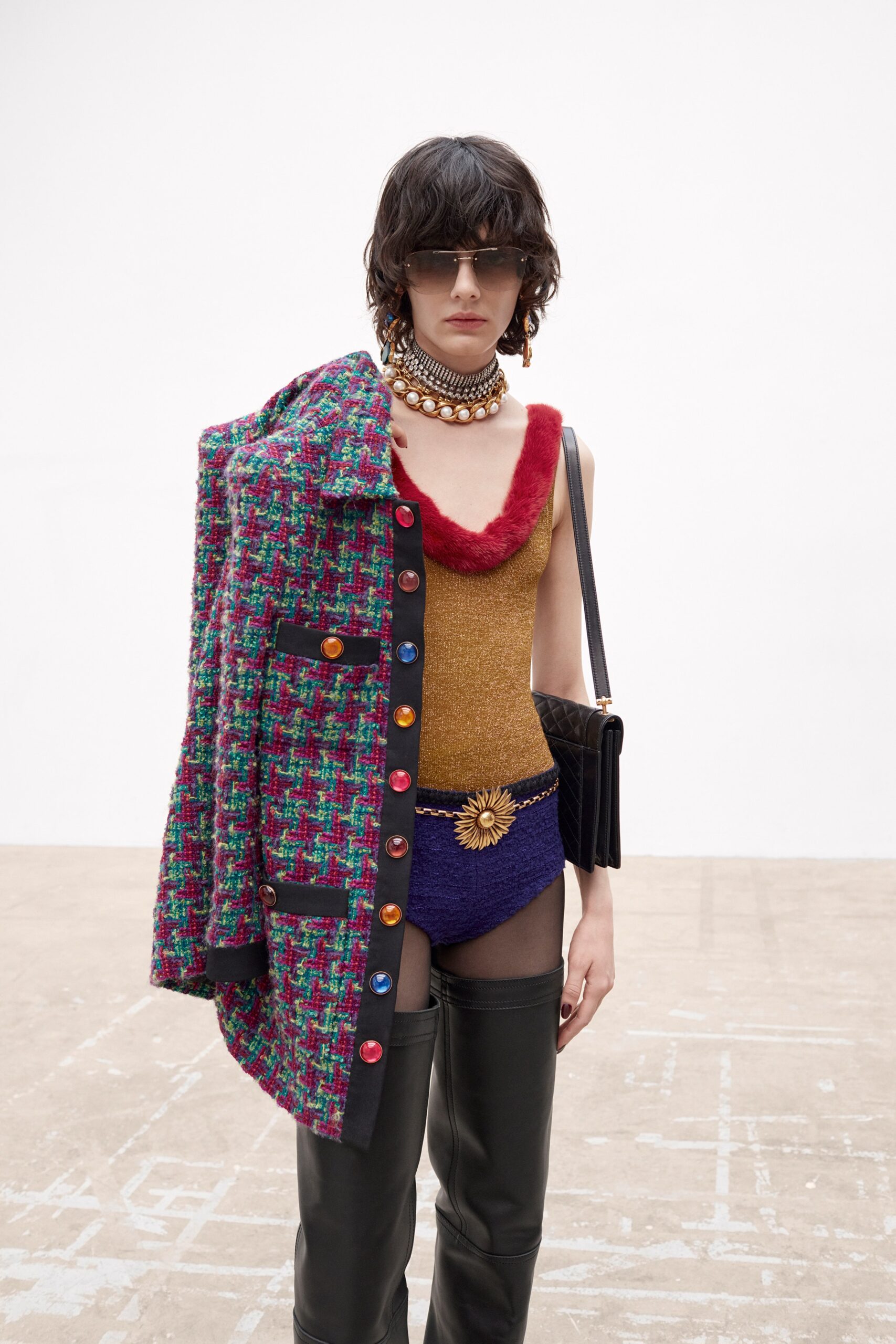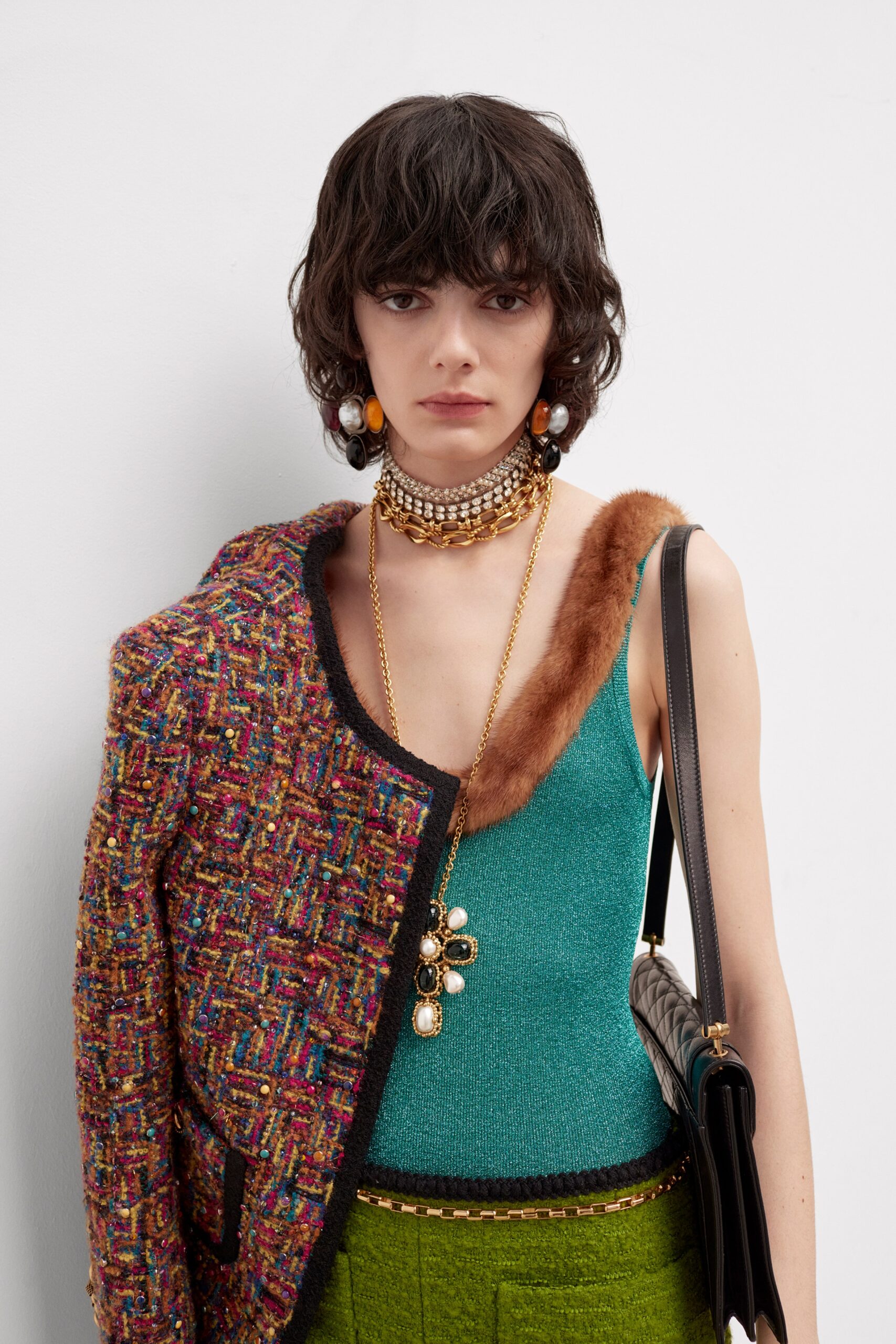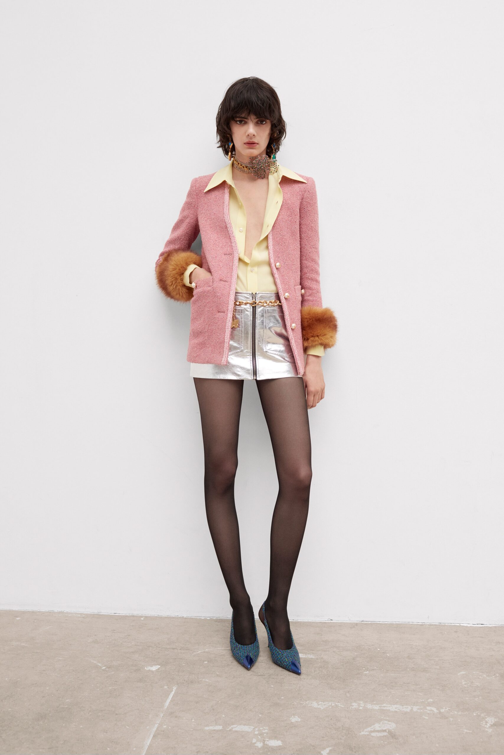 Bu kez Mösyö Saint Laurent’in erkek giyim kumaşlarında kullandığı klasik ve zarif, 60’ların ortalarındaki dokulara dikkat çekilen koleksiyonda yine Saint Laurent’in tercih ettiği monokromatik palet; bu kez menekşe, kobalt, altın ve şartröz sarısı ile zenginleşiyor. Vaccarello bu formülü “60’ların şekilleri ve 80’lerin renkleri” olarak tanımlıyor.