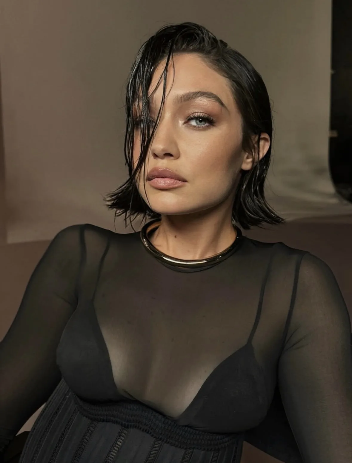 Fotoğraf serisinde Hadid’i, ıslak görünümlü, derin yan ayrımla şekillendirilmiş, jilet gibi kesilmiş ve çene hattını zar zor geçen kömür siyahı bir mini bob ile görüyoruz. Bu görünüm, Maybelline iş birliği için hazırlandığından, makyaj da doğal olarak iddialı: koyu smokey gözler, gül tonlarında ruj, hafif bir aydınlatıcı, kabarık kaşlar ve heykelsi elmacık kemikleri. Transparan, uzun kollu ve korsaj detaylı bir üstü, gümüş choker kolyeyle tamamlıyor. Yine de gecenin yıldızı net: saçları. Hemen ardından ise yeni siyah tonun içinde her zamankinden bile daha çarpıcı duran mavi gözleri.