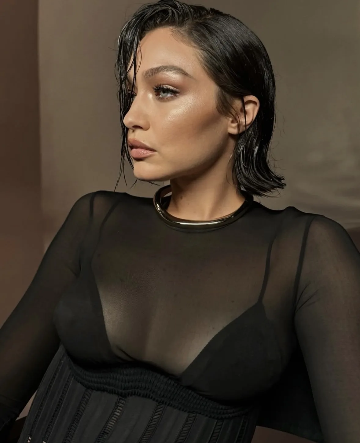 Fotoğraf serisinde Hadid’i, ıslak görünümlü, derin yan ayrımla şekillendirilmiş, jilet gibi kesilmiş ve çene hattını zar zor geçen kömür siyahı bir mini bob ile görüyoruz. Bu görünüm, Maybelline iş birliği için hazırlandığından, makyaj da doğal olarak iddialı: koyu smokey gözler, gül tonlarında ruj, hafif bir aydınlatıcı, kabarık kaşlar ve heykelsi elmacık kemikleri. Transparan, uzun kollu ve korsaj detaylı bir üstü, gümüş choker kolyeyle tamamlıyor. Yine de gecenin yıldızı net: saçları. Hemen ardından ise yeni siyah tonun içinde her zamankinden bile daha çarpıcı duran mavi gözleri.