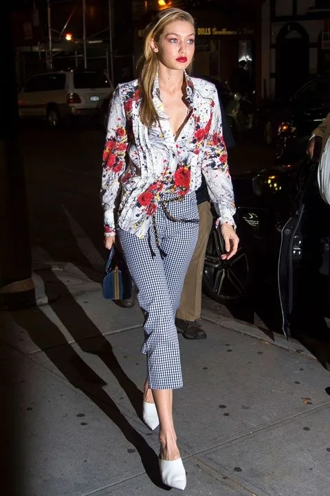 Floral Prada bluzu, Miaou imzalı pötikare pantalonu ve Stella Luna ayakkabılarıyla New York’ta bir çekime giderken.