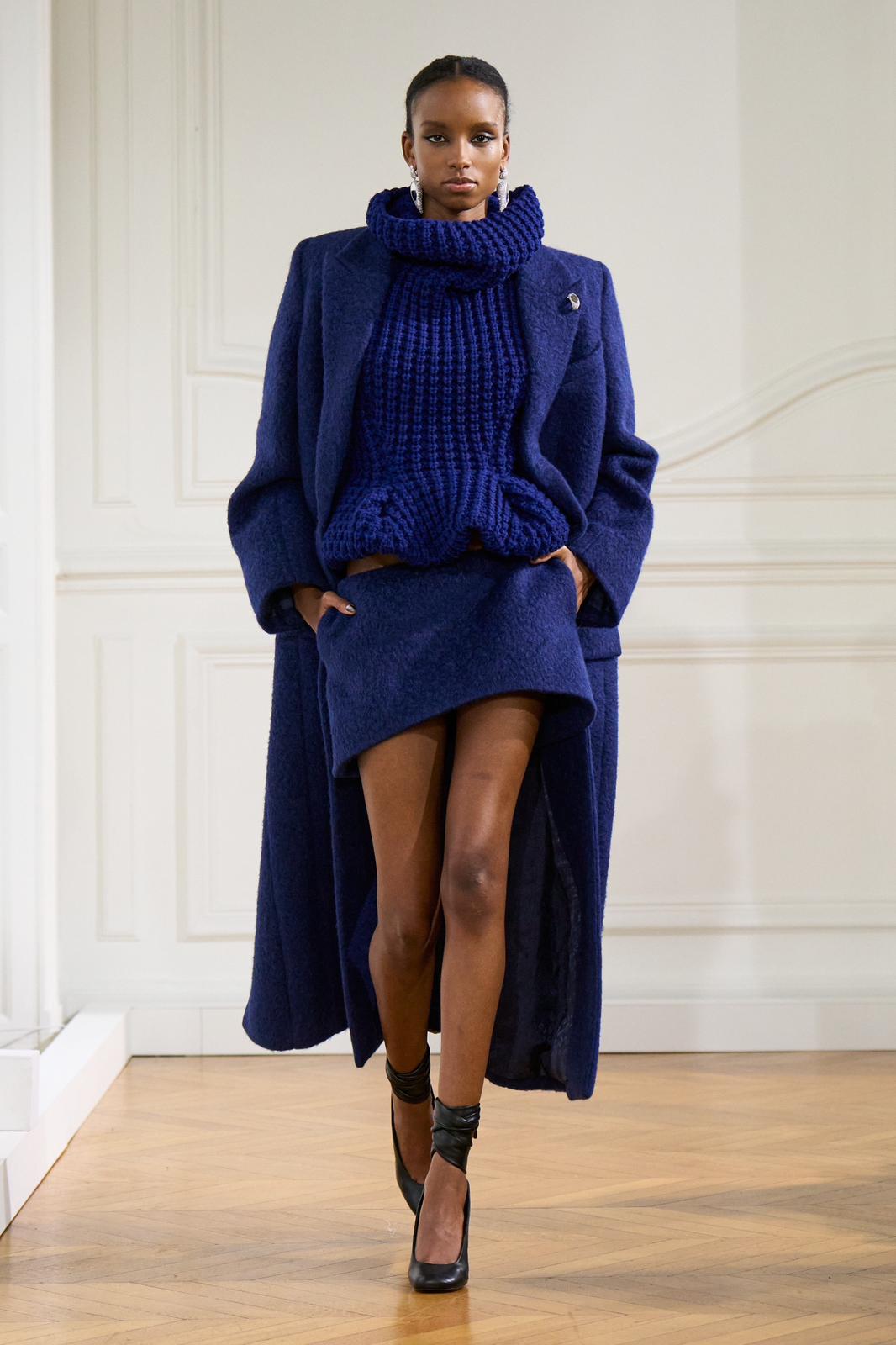 80’lerden esinlenen detaylar, tombul kürkler ve dik omuzlu takım elbise ceketleri koleksiyona dinamizm kattı. Usta terzilik, balıksırtı yünlerden yapılmış uzun paltolar ve arşivden esinlenen desenlerle süslenmiş pantolon ceket kombinasyonlarıyla zirveye çıktı.