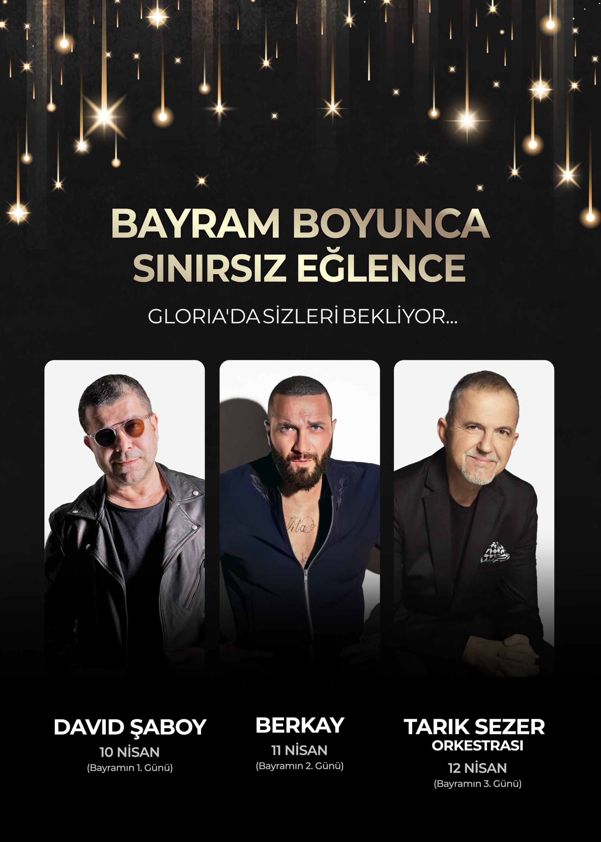 Gloria Hotels & Resorts, keyifli bayram tatilini eğlenceli sahne performanslarıyla unutulmaz kılmaya hazırlanıyor. 10 Nisan’da DJ David Şaboy’un muhteşem performansıyla başlayacak kesintisiz eğlence, 11 Nisan’da dillere dolanan şarkıları ve sahnesiyle Berkay, 12 Nisan akşamında ise Tarık Sezer Orkestrası eşsiz performansıyla Gloria Hotels & Resorts sahnesinde misafirlerle buluşuyor. Gloria Hotels & Resorts, güçlü sahne koreografilerinin ve konserlerin yer alacağı müzik ve dans dolu bir bayram tatili arayanların değişmeyen adresi olarak sezona damga vurmaya devam ediyor.