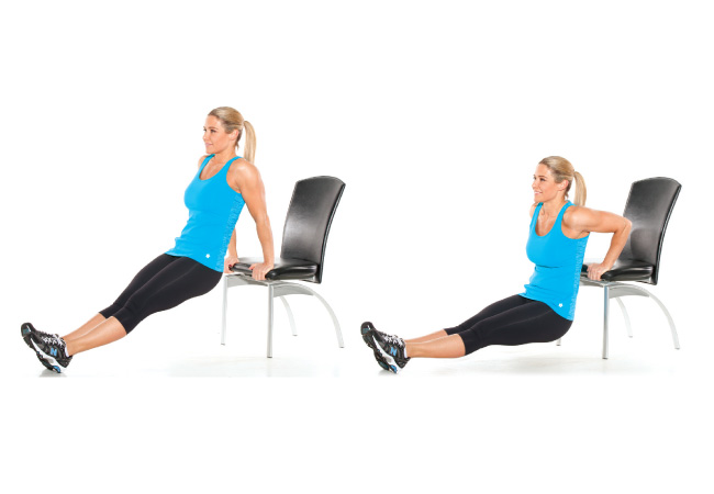 Sandalye Bir sandalyenin önünde oturun. Kollarınızla arkada 90 derecelik açı olacak şekilde destek alın ve topuklarınızla da bu desteği kuvvetlendirerek kendinizi yukarı çekin, tekrar aşağıya indirin. Chair-dips