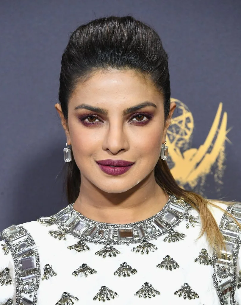 Priyanka Chopra Balmain elbisesiyle uyumlu küpeleri, görünümünü daha da güçlendiriyor.