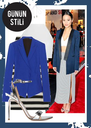 Yeni stil ikonlarından Jamie Chun crop top çılgınlığına uzun kalem etek ve blazer ceketiyle farklı bir yorum getiriyor.