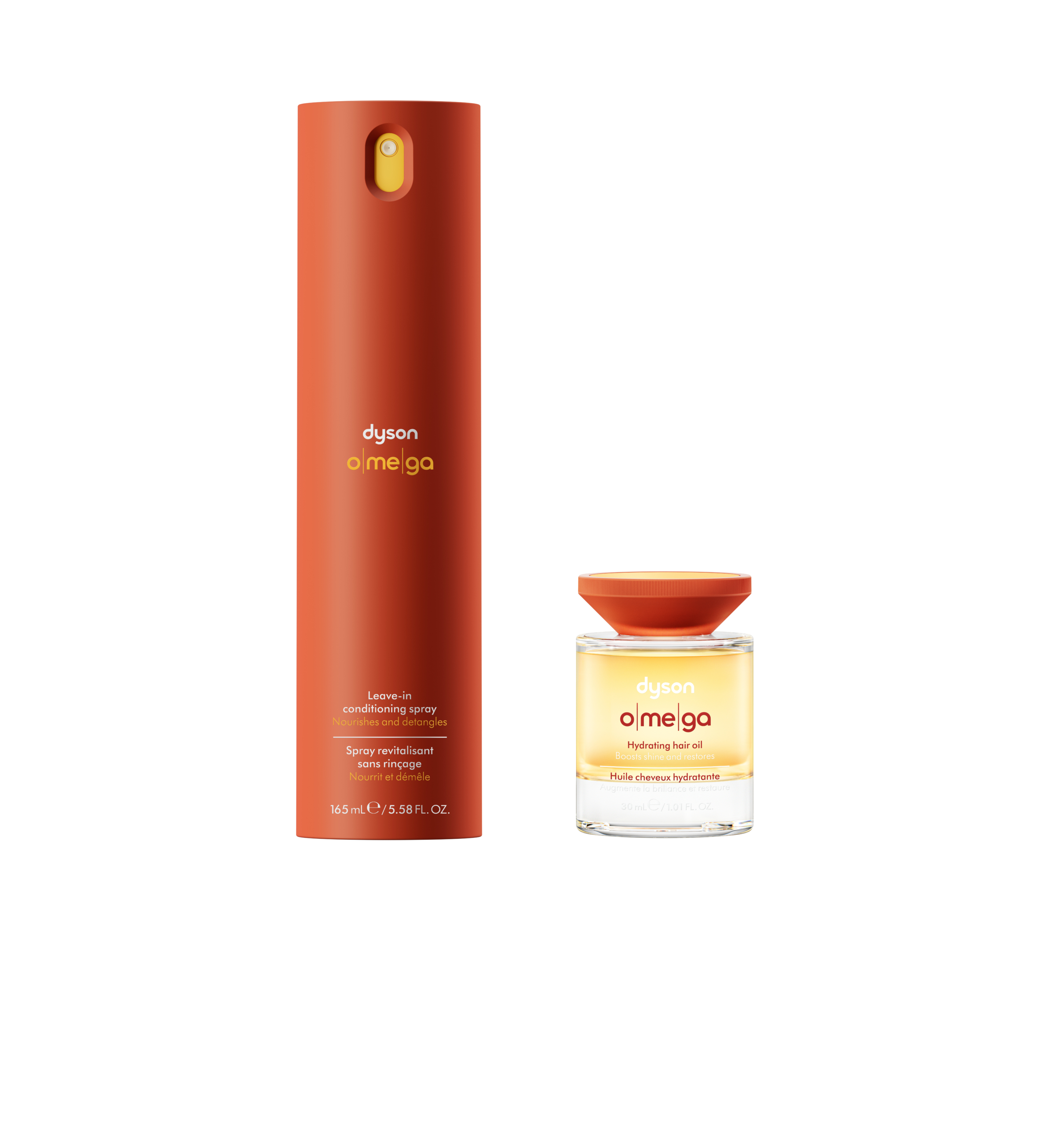Dyson Omega™ nemlendirici saç bakım yağı ambalajı, yağın zengin doğal rengini gösterecek şekilde cam formunda şekillendirildi. Dyson mühendisleri 112 farklı cam şişeyi denedikten sonra, kazara dökülmeleri önlemek için dengeyi artıran ağır, sağlam bir tasarım seçti. Özel kapak, yağ ile kayganlaştığında bile ellerinizden kaymayacak sağlam bir tutuş sunarak dengeyi daha da artırıyor.