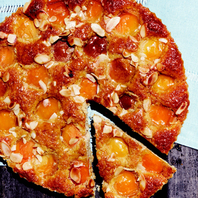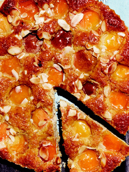 4. Hamuru hafifçe yağlanmış tart kalıbına alarak yerleştirin. Üzerine ikiye ayrılmış kayısı ve bademleri dizin.