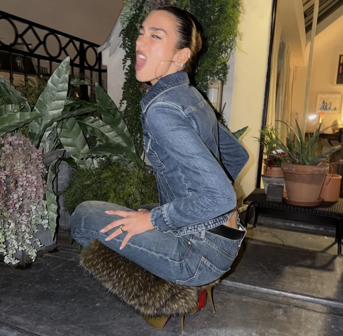 Modanın ciddi olmak zorunda olmadığının kanıtı. Baştan aşağı denim (double denim) görünümünü, o devasa tüylü topuklu botlarla tamamlayarak “camp” modasını sokağa indiriyor; cesur, oyuncu ve kesinlikle ikonik.