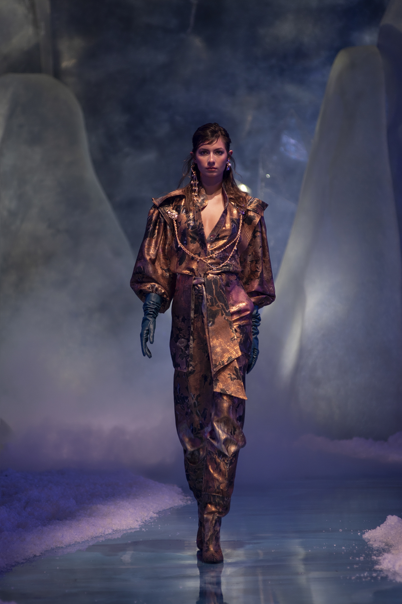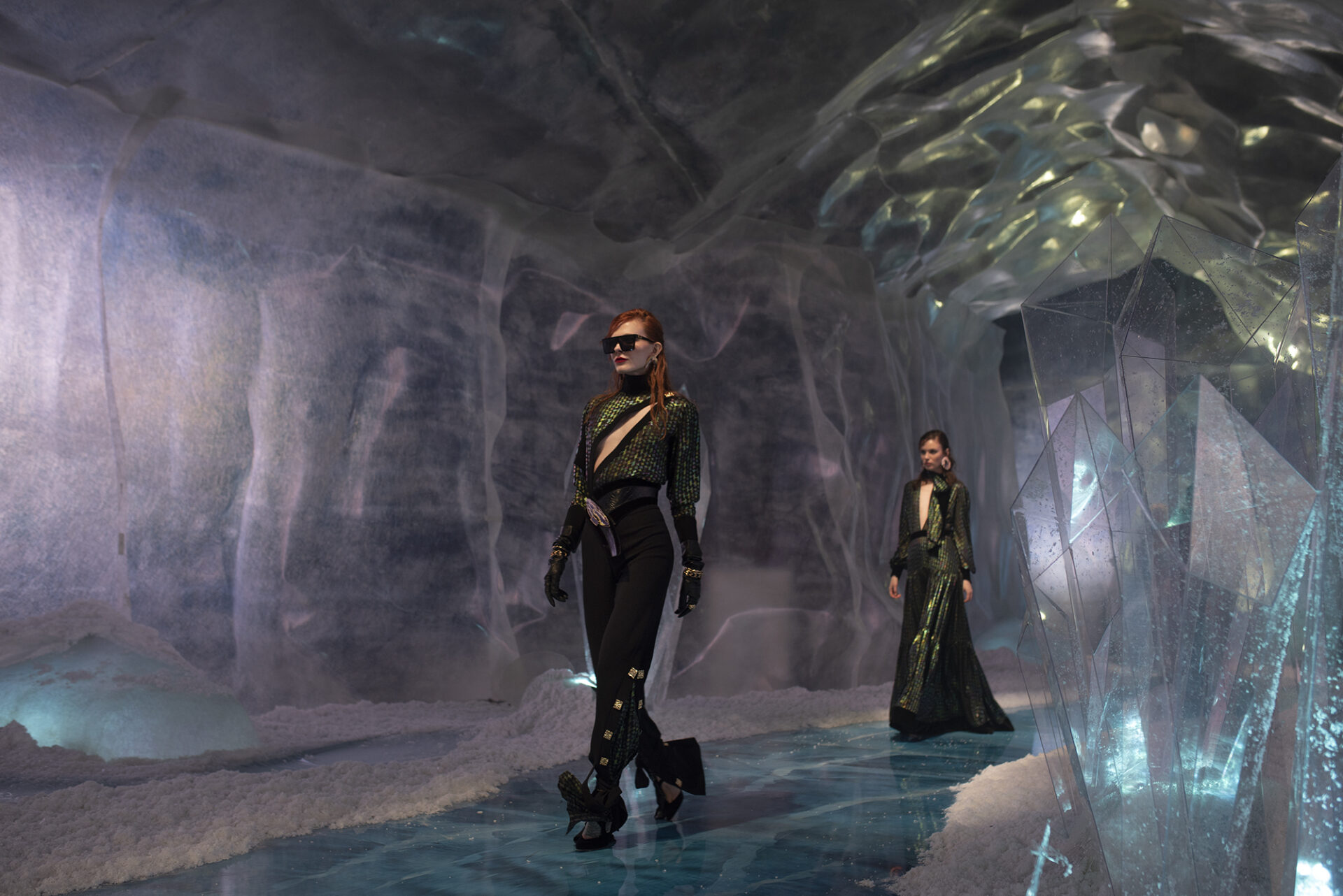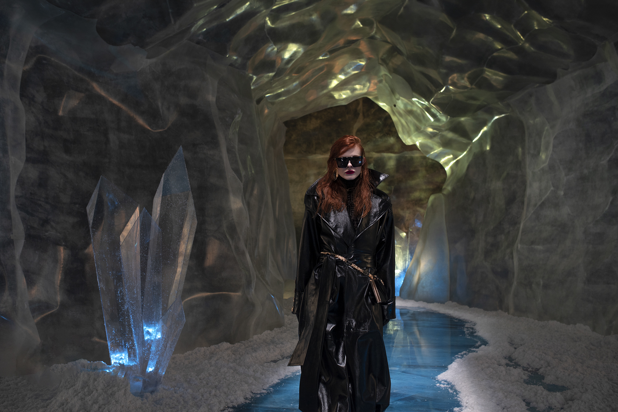 Yeni koleksiyonunu kendi tasarladığı bir dünyada sunan HALEIA, bu cesur dünyayı bir buz mağarasının içinde kurdu. HALEIA, Sonbahar/Kış 2021-2022 dijital defilesini içinde kristallerinde yer aldığı bu mağaralardan ilham alarak dekore ettiği bir dünyada gerçekleştirdi. Buz kristalleri gibi güçlü ve maskülen bir dokuyu tasarımlarının feminen yönüyle buluşturan HALEIA, oluşturduğu bu kontrastla HALEIA kadınını da bir atıfta bulundu. ‘Over Exposed’ vurgusunun hem sunulan tasarımlarda hem de kurulan bu dünyada desteklendiği dijital defile, dünya standartlarında bir görsel zenginlik sundu. Buz mağaralarının yaşadığımız dünya için keşfe açık olmasının HALEIA’ya yaptığı self-reflexive vurgunun yanı sıra, kaygan ve eriyen bir dünyanın içinde HALEIA’nın güçlü tasarımlarıyla bu dünya içerisindeki gücüne ve nasıl konumlanabileceğine dair ipuçlarını verdi.