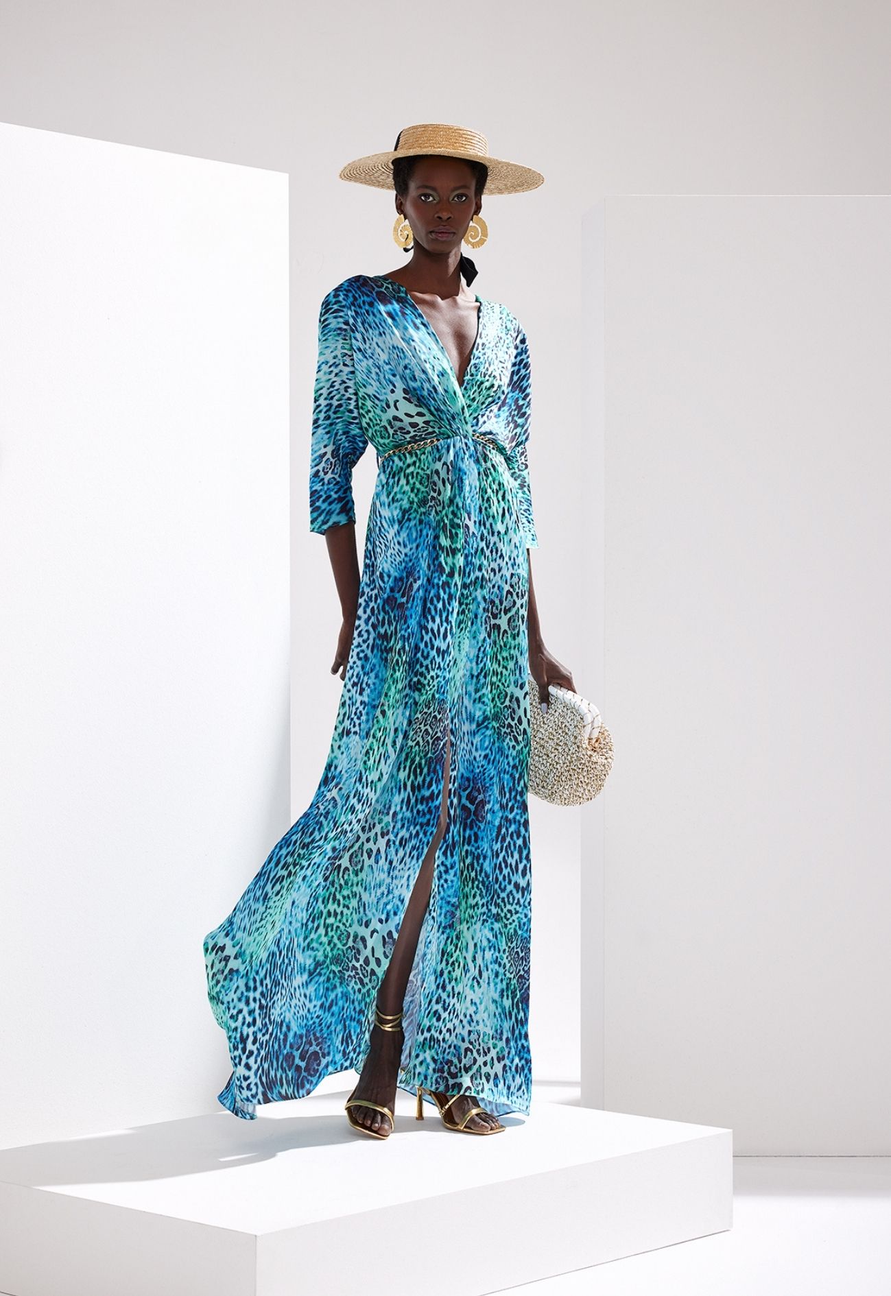 Desenli Gold Zincir Detaylı Maxi Elbise