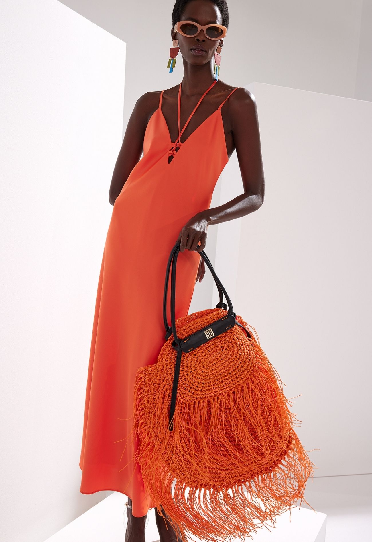 Explosion koleksiyonunda teninize sıcaklık katacak çok sayıda renk bulabilmeniz mümkün. İddialı renkleri bir o kadar iddialı ve özgün elbise tasarımlarında kullanan marka, tüm ten renklerine uygun parçalar bulabileceğiniz oldukça geniş koleksiyonuyla sezona damga vurmaya hazır. Bu özel turuncu elbise, parlak renginin yanı sıra özel dekoltesi ve askı detaylarıyla da oldukça farklı ve etkileyici. Hem akşam hem de gündüz saatlerinde tercih edebileceğiniz bu şıklığı farklı tarz ayakkabı ve takılarla tamamlayarak özgün görünüşler oluşturmanız da mümkün.