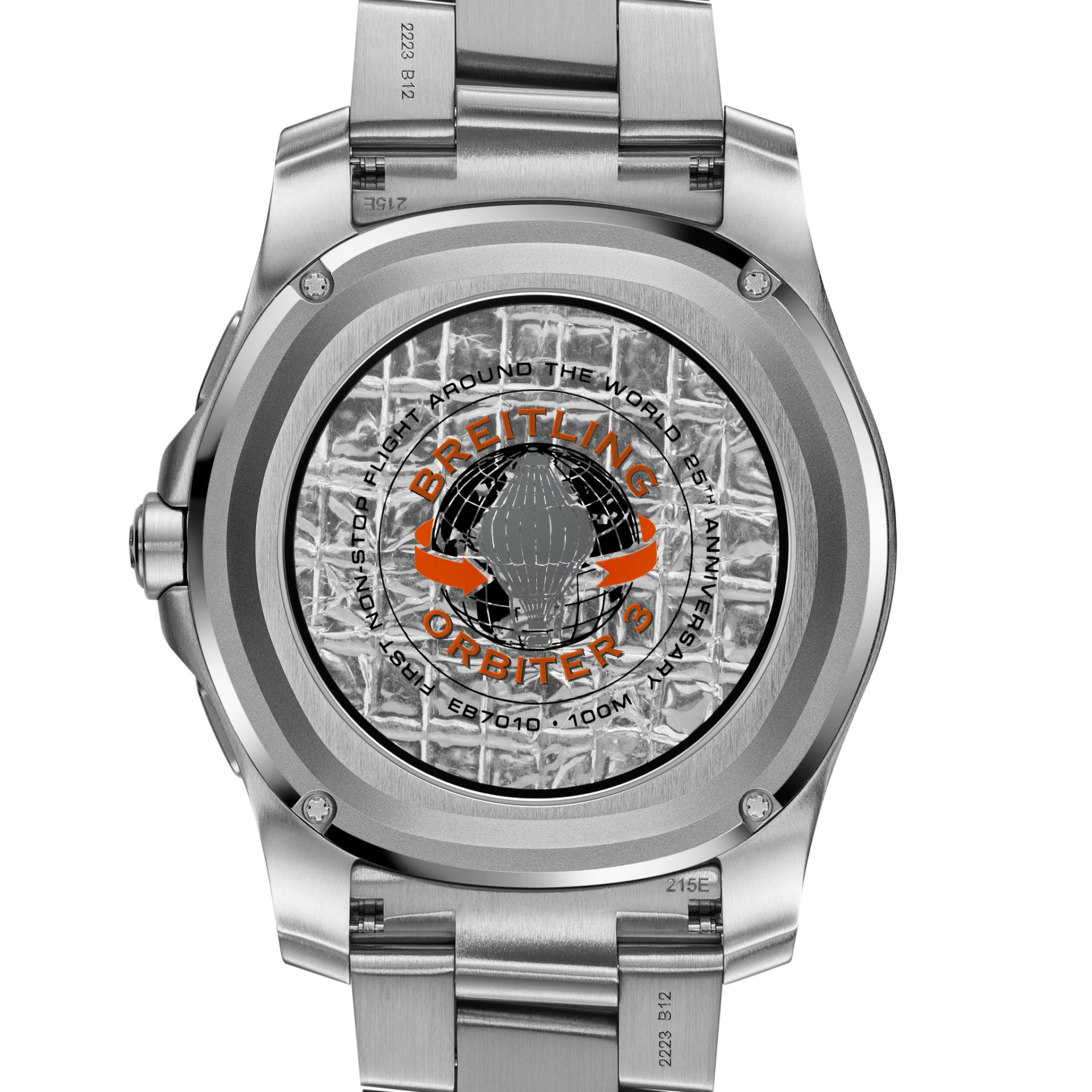 Orbiter 3 kapsülünün rengindeki parlak turuncu kadranıyla uçuşun 25. yılını kutlayan Aerospace B70 Orbiter, tarihsel bir ögeyi de barındırıyor: Kasanın şeffaf arka yüzeyinden, orijinal Breitling Orbiter 3 balonunun bir parçası görülüyor. Aynı yerde, Breitling Orbiter 3 görev logosu ve “First non-stop flight around the world 25th anniversary” (“Dünya etrafında ilk hiç durmadan gerçekleştirilen uçuşun 25. yıl dönümü”) yazısı da mevcut.
