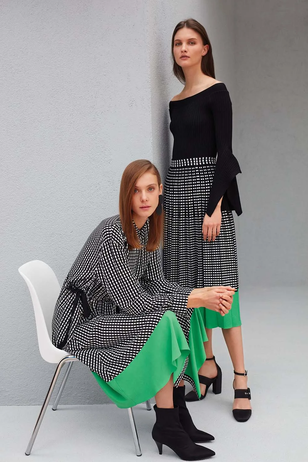 Zengin desen ve dokularla hem lüks hem de spor bir görünüm katan geometrik desenli pilili etekler, elbiseler ve volan detayl? bluzlar bel hatt?na vurgu yapan kemer detaylar?yla modern siluetlere referans veriyor. Asimetrik ba?lama detayl? etekler ve cut out triko kombinleri dantel detaylar?yla öne ç?karken, gard?robunuzun kurtar?c?s? olmaya devam ediyor. Il?k havalar? ça?r??t?ran soft pembenin yan? s?ra mavi, beyaz ve lacivert üçlüsünün tamamlad??? tak?mlar, ince trikolarla smart casual görünümünü desteklerken; tüvit ve lazer kesimli ceketler ?ehir kad?n?n?n ofis ??kl???n? en üst noktaya ç?kar?yor. Çiçek desenleri ve teknik kuma? üzerine floral desenli cropped mont ve bel k?sm? ba?lama detayl? trençkotlar hafif meltem sonras? üstünüze alabilece?iniz parçalar aras?nda yerini al?yor. Zarafetin en yal?n halini temsil eden parçalar, püskül ve süet detaylardan ilham alan Vah?i Bat? esintisiyle kar??m?za ç?k?yor. Siyah ve beyaz?n ön planda oldu?u etnik desenler; trok, piercing ve i?lemelerle bulu?arak sizi ??k bir stil düellosuna davet ediyor.