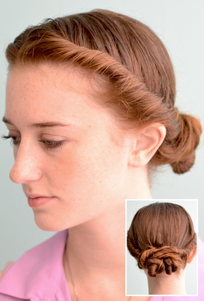 Wet_Hair_2 Saçınızı ortadan ikiye ayırıp yukarı içe doğru sıkı sıkı burun. Daha sonra bu sıkı burgularınızı, arkada firketelerle bir topuz haline getirin.