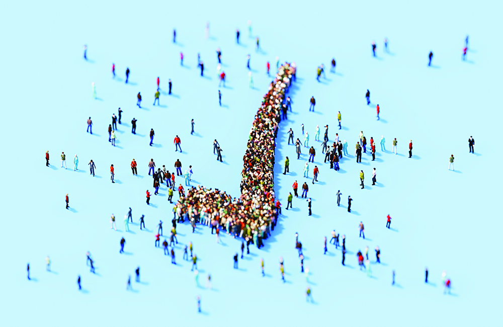Human crowd forming check mark blue background. Horizontal composition with copy space.
